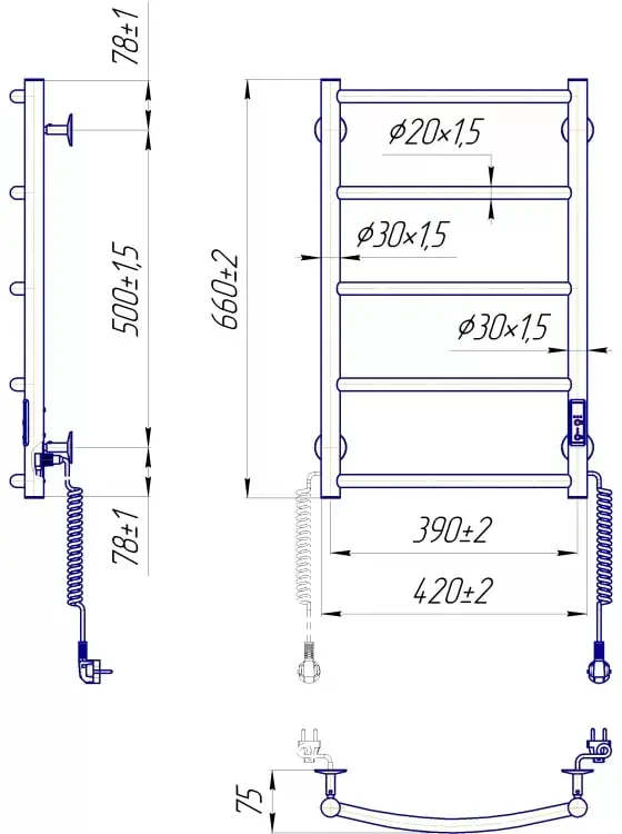 Електросушарка для рушників побутова Класік НР-I 650х430/75 TR К. Обладнана таймер-регулятором та конектором для підключення в розетку з будь-якого боку. Сумісна з комплектом прихованого підключення. Має 5 ребер та стояки з круглої труби.