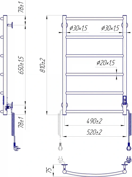 Електросушарка для рушників побутова Класік НР-І 800х530/85 TR К. Обладнана таймер-регулятором та конектором для підключення в розетку з будь-якого боку. Сумісна з комплектом прихованого підключення. Має 6 ребер та стояки з круглої труби.