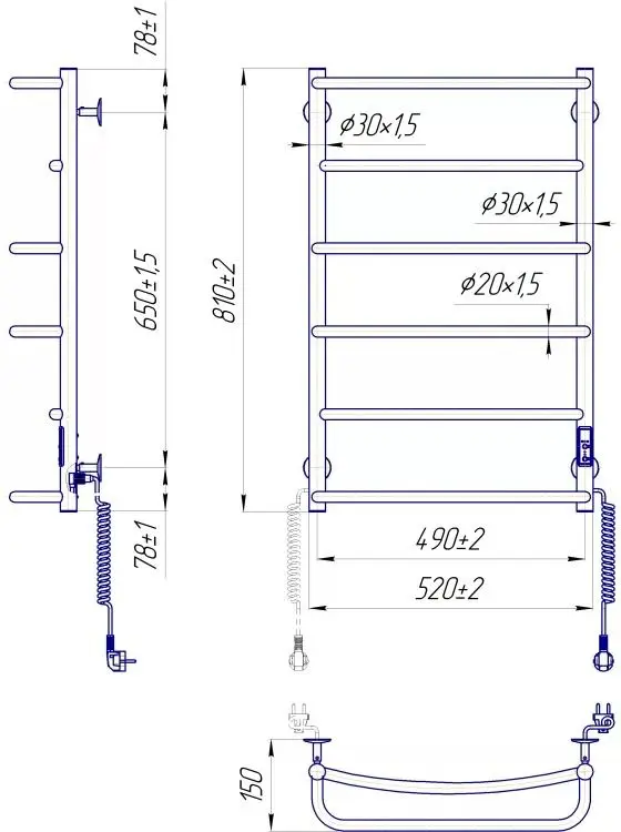 Електросушарка для рушників побутова Люкс НР-І 800х530/150 TR К. Обладнана таймер-регулятором та конектором для підключення в розетку з будь-якого боку. Сумісна з комплектом прихованого підключення. Має 6 ребер та стояки з круглої труби.