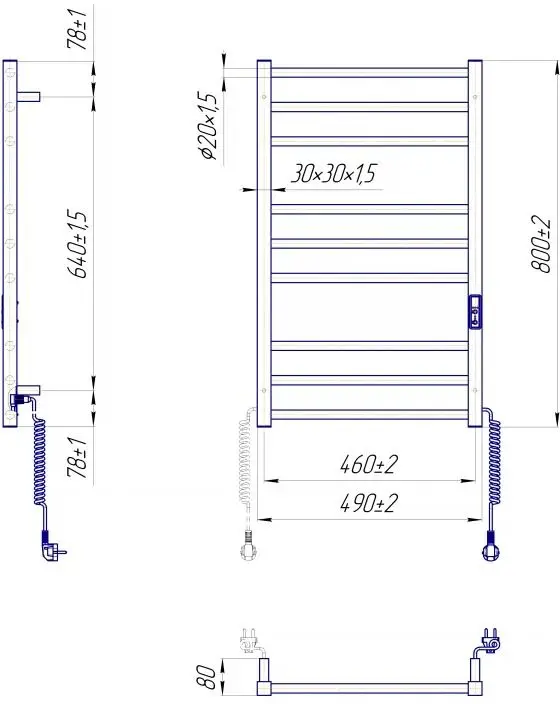 Електросушарка для рушників побутова Преміум Класік-I 800х500/80 TR К. Обладнана таймер-регулятором та конектором для підключення в розетку з будь-якого боку. Сумісна з комплектом прихованого підключення. Має 9 ребер та стояки з профільної труби.