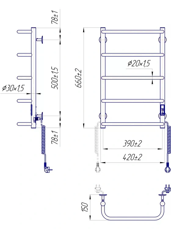 Електросушарка для рушників побутова Стандарт НР-І 650х430/150 TR К. Обладнана таймер-регулятором та конектором для підключення в розетку з будь-якого боку. Сумісна з комплектом прихованого підключення. Має 5 ребер та стояки з круглої труби.