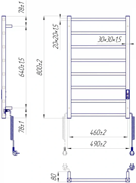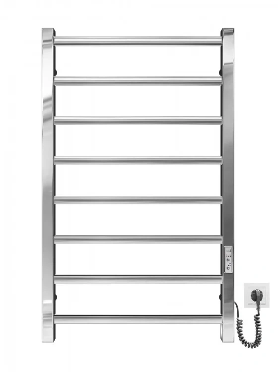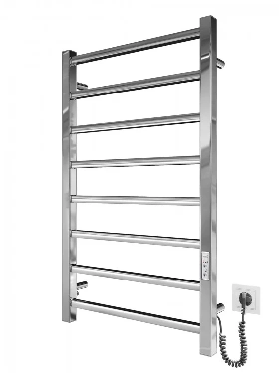Електросушарка для рушників побутова Токіо-I 800х500/80 TR К. Обладнана таймер-регулятором та конектором для підключення в розетку з будь-якого боку. Сумісна з комплектом прихованого підключення. Має 8 ребер та стояки з квадратного профілю.
