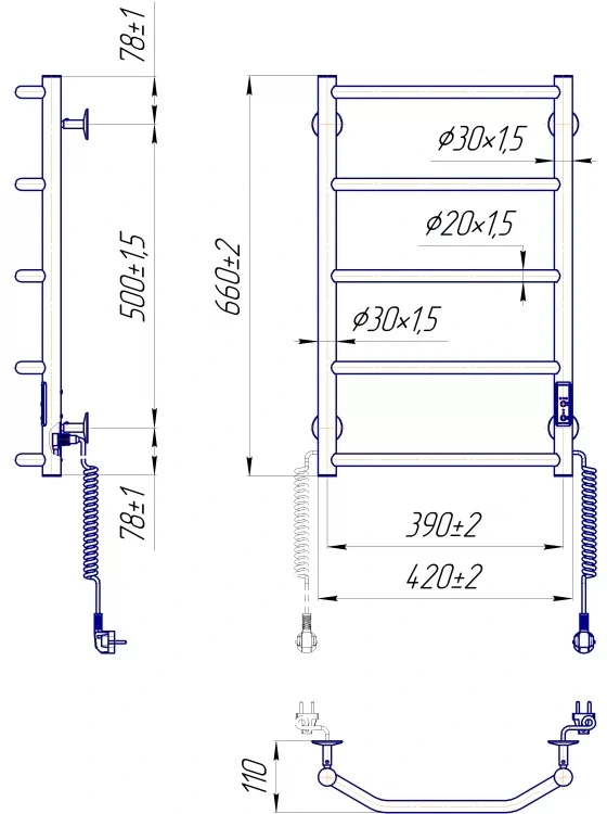 Електросушарка для рушників побутова Трапеція НР-І 650х430/110 TR К. Обладнана таймер-регулятором та конектором для підключення в розетку з будь-якого боку. Сумісна з комплектом прихованого підключення. Має 5 ребер та стояки з круглої труби.