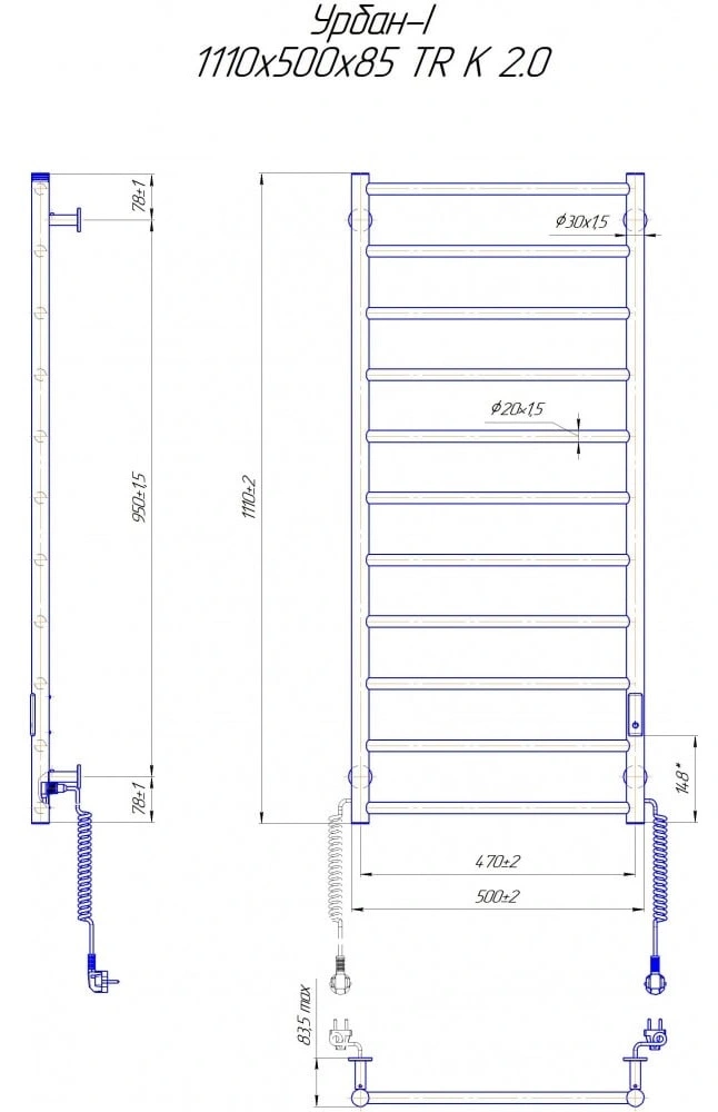 Електросушарка для рушників побутова Урбан-I 1110x500-85. Обладнана таймер-регулятором та конектором для підключення в розетку з будь-якого боку. Сумісна з комплектом прихованого підключення. Має 11 ребер та стояки з круглої труби.