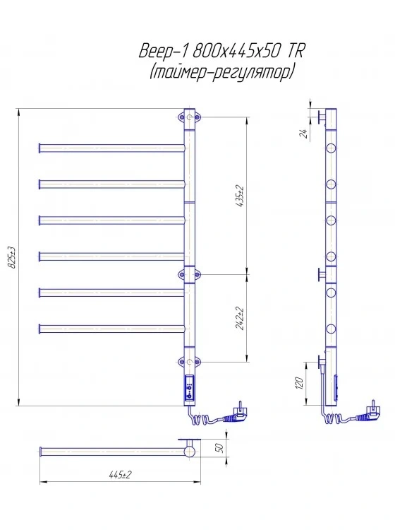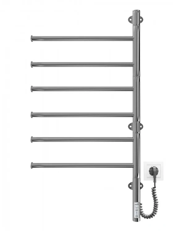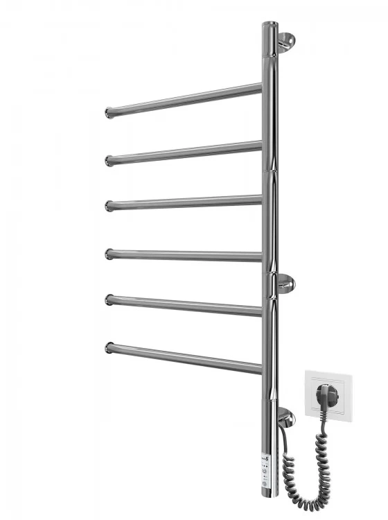 Електросушарка для рушників побутова Веєр-I 800х445/55 TR. Обладнана таймер-регулятором. Можлива варіація з комплектом прихованого підключення. Має 6 ребер які повертаються на 180* та стояк з круглої труби.
