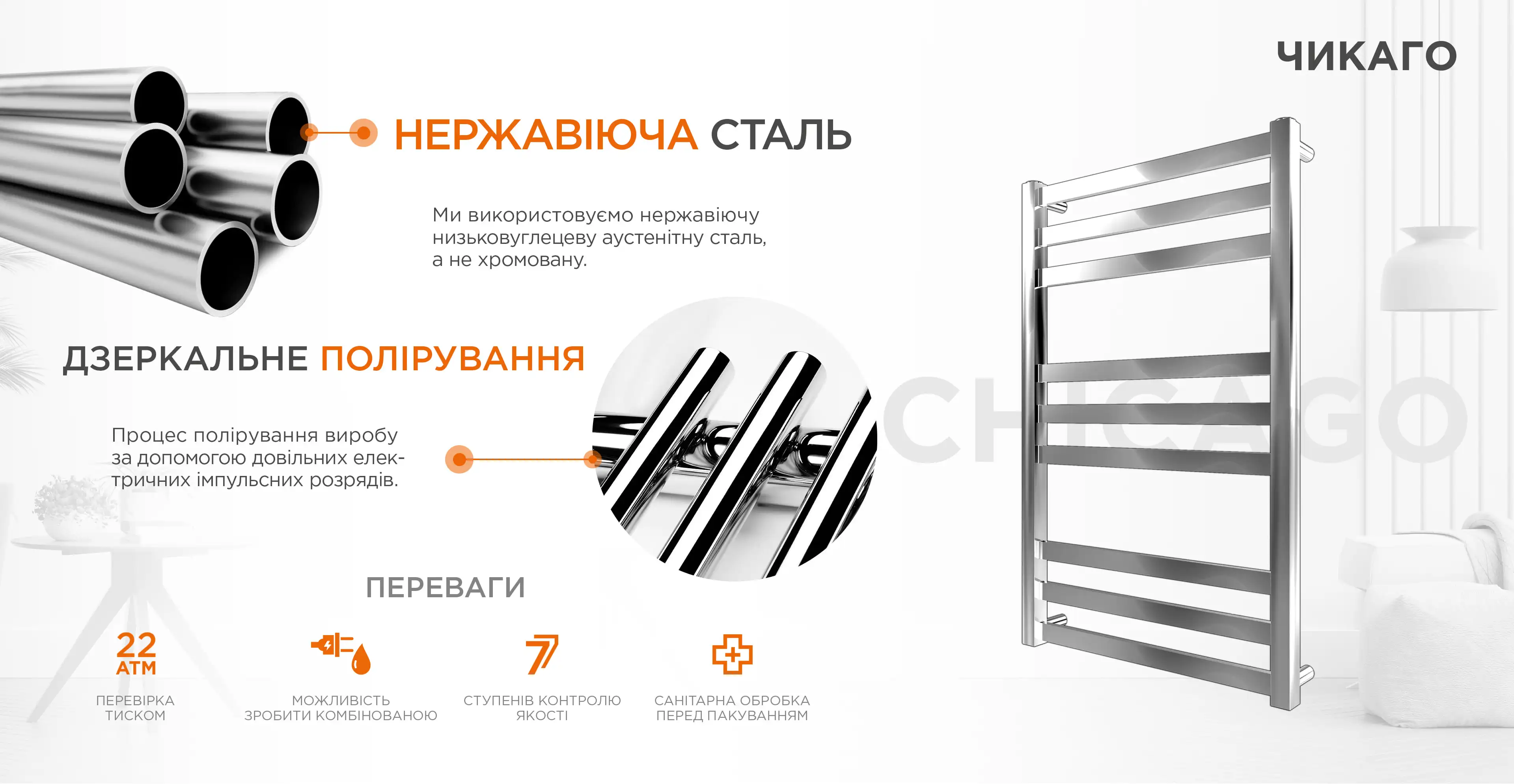 Рушникосушка Mario водяна Чікаго, 800x530x500мм, комбі підключення, нержавійка, хром