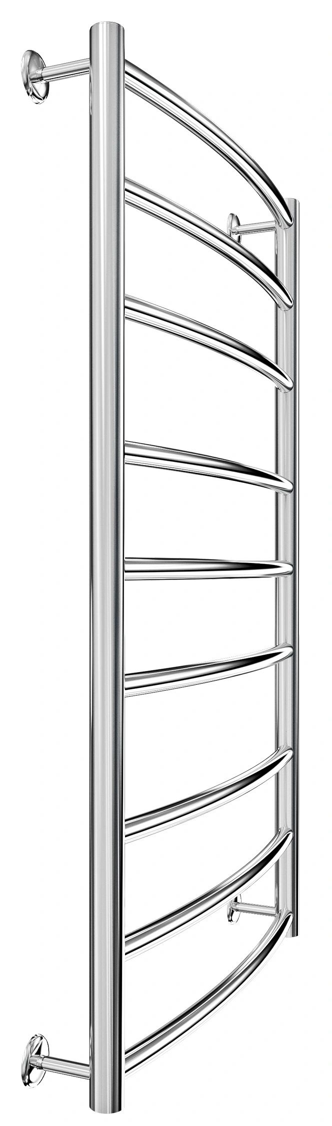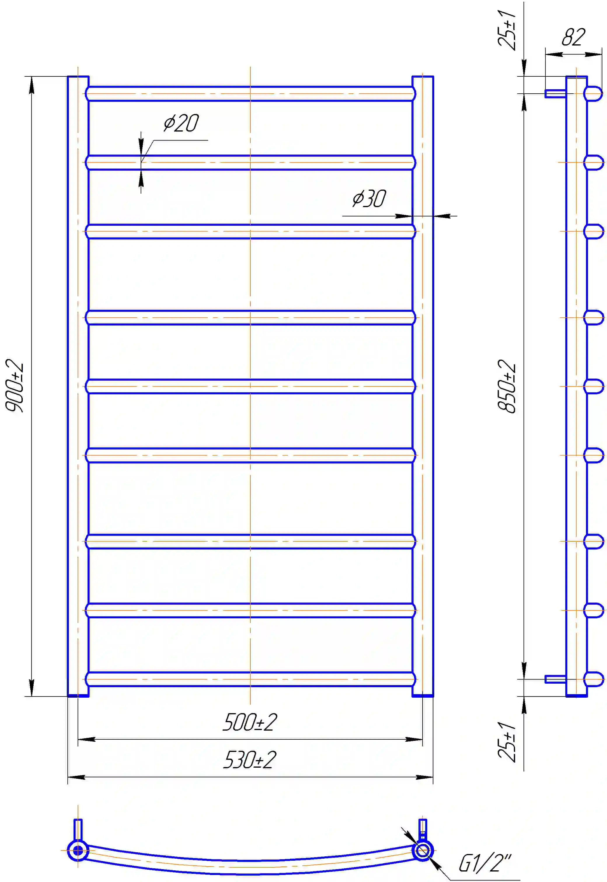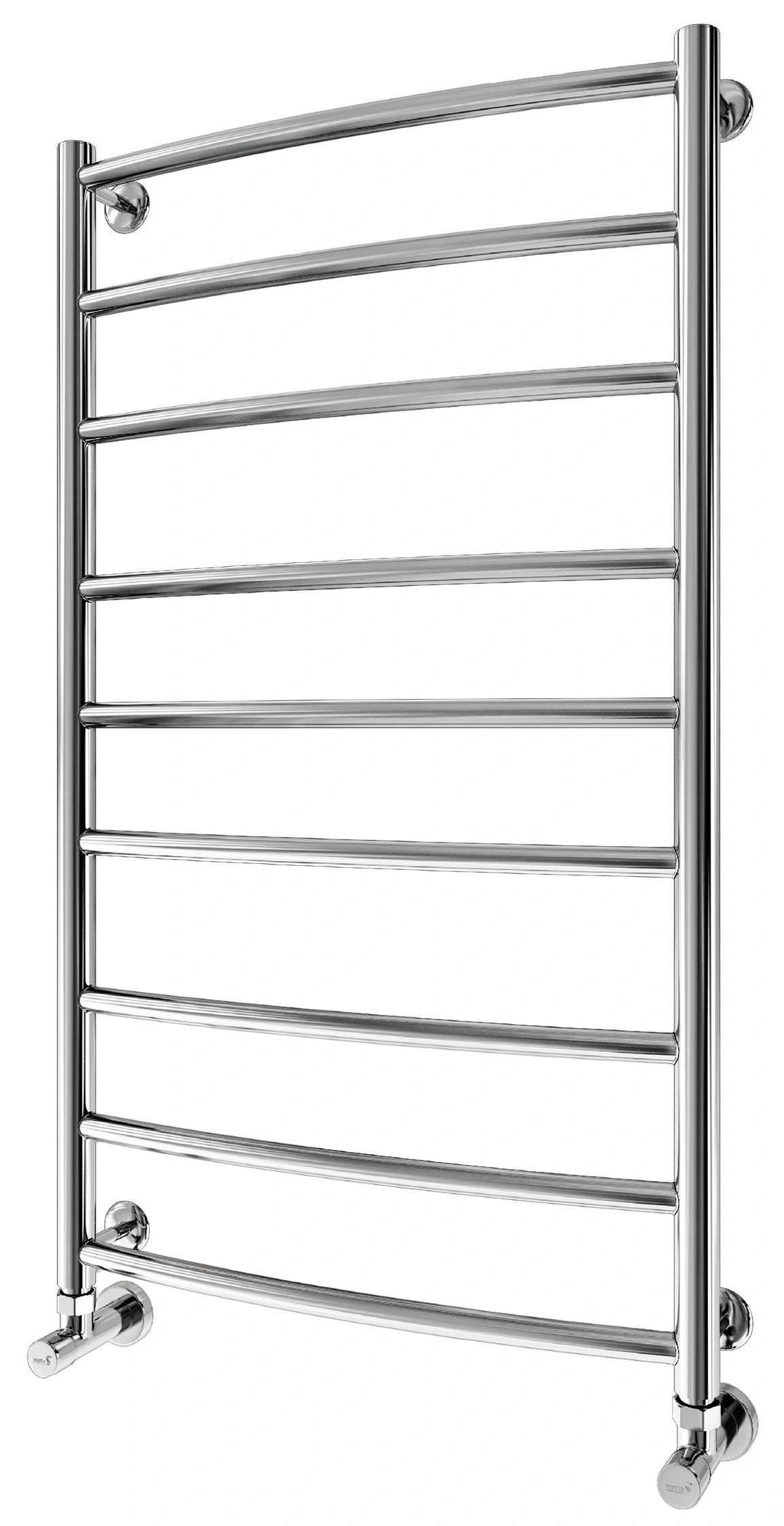 Рушникосушарка "Маріо" Стандарт 900х530/500. Розміри: висота - 900 мм, ширина - 530 мм, глибина 170 мм, міжцентрова відстань для підключення - 500 мм, діаметр підключення G1/2''. Варіанти підключення: нижнє, діагональне та бічне. Кількість ребер - 9, стояки з круглої труби. Виготовлена з полірованої нержавіючої сталі без хромування. Варіанти покриття: полірована або сатин, чорний мат, білий глянець, золото, бронза.