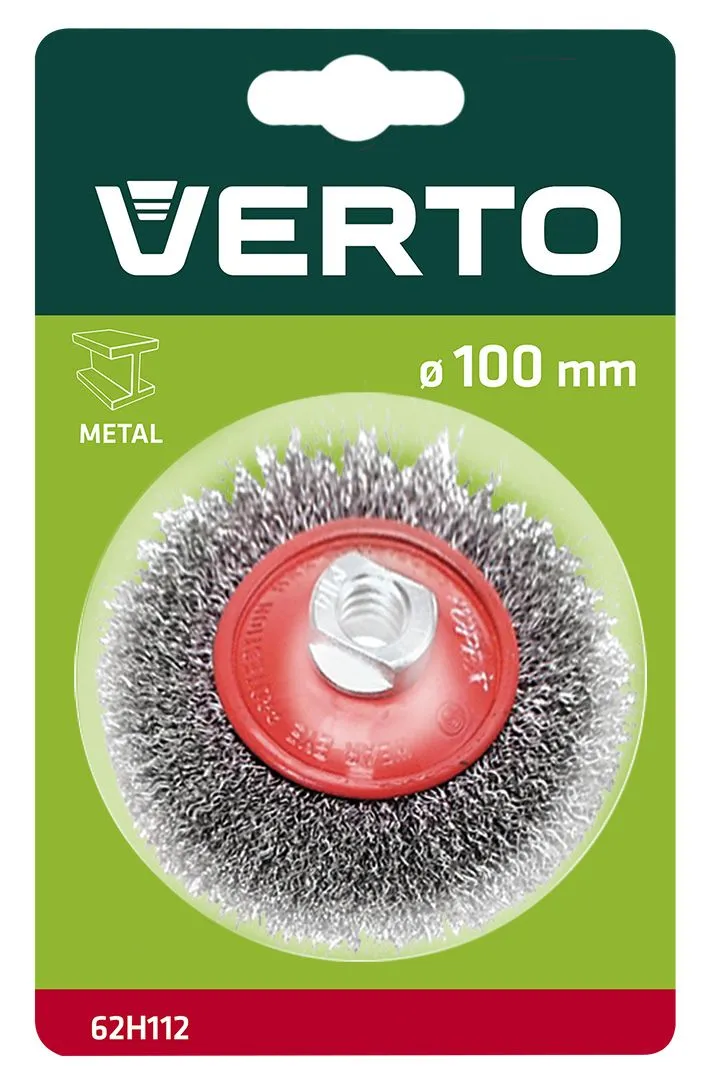 Дротяна щітка VERTO (арт. 62H112) діаметром 100 мм, виготовлена зі сталевого дроту товщиною 0,33 мм. Посилена конструкція кузова дозволяє ефективно очищати металоконструкції. Кріплення адаптоване для використання з кутовими шліфувальними машинами. Бренд VERTO пропонує широкий асортимент електроінструментів та аксесуарів для кожного майстра.