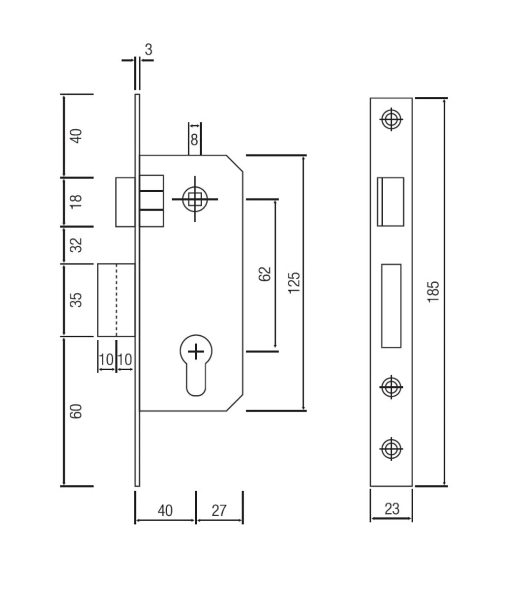 Замок SIBA врезной 10037/D 62/40 мм 1 ригель CP Полированный хром