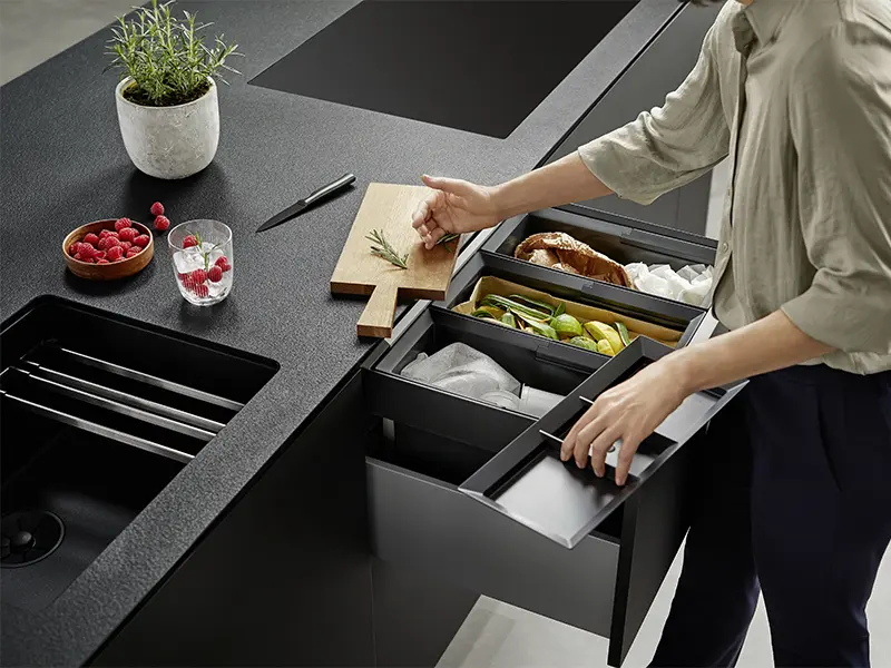 Різноманітні варіанти вибору та зберігання відходів за рахунок гнучких комбінацій відер для сміття з вимогами до розмірів у тумбі під мийкою.