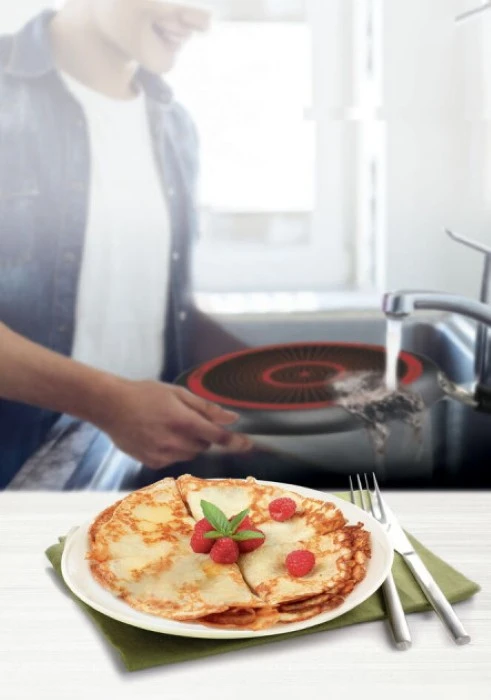 Нова сковорода для млинців Simply Clean дає чудові результати без зайвого клопоту. Відкрийте для себе посуд з антипригарним покриттям - всередині та зовні - для гладкого й легкого очищення, яке не може бути простішим. Високоякісне титанове покриття розраховане на тривалий термін експлуатації, дифузійна основа забезпечує оптимальний розподіл тепла для рівномірного приготування їжі, а міцна зафіксована ручка забезпечує поліпшену ергономіку для максимального комфорту. Tefal пропонує кухонний посуд, щоб прискорити процес готування, даючи вам більше часу, щоб зосередитися на тому, що важливо.