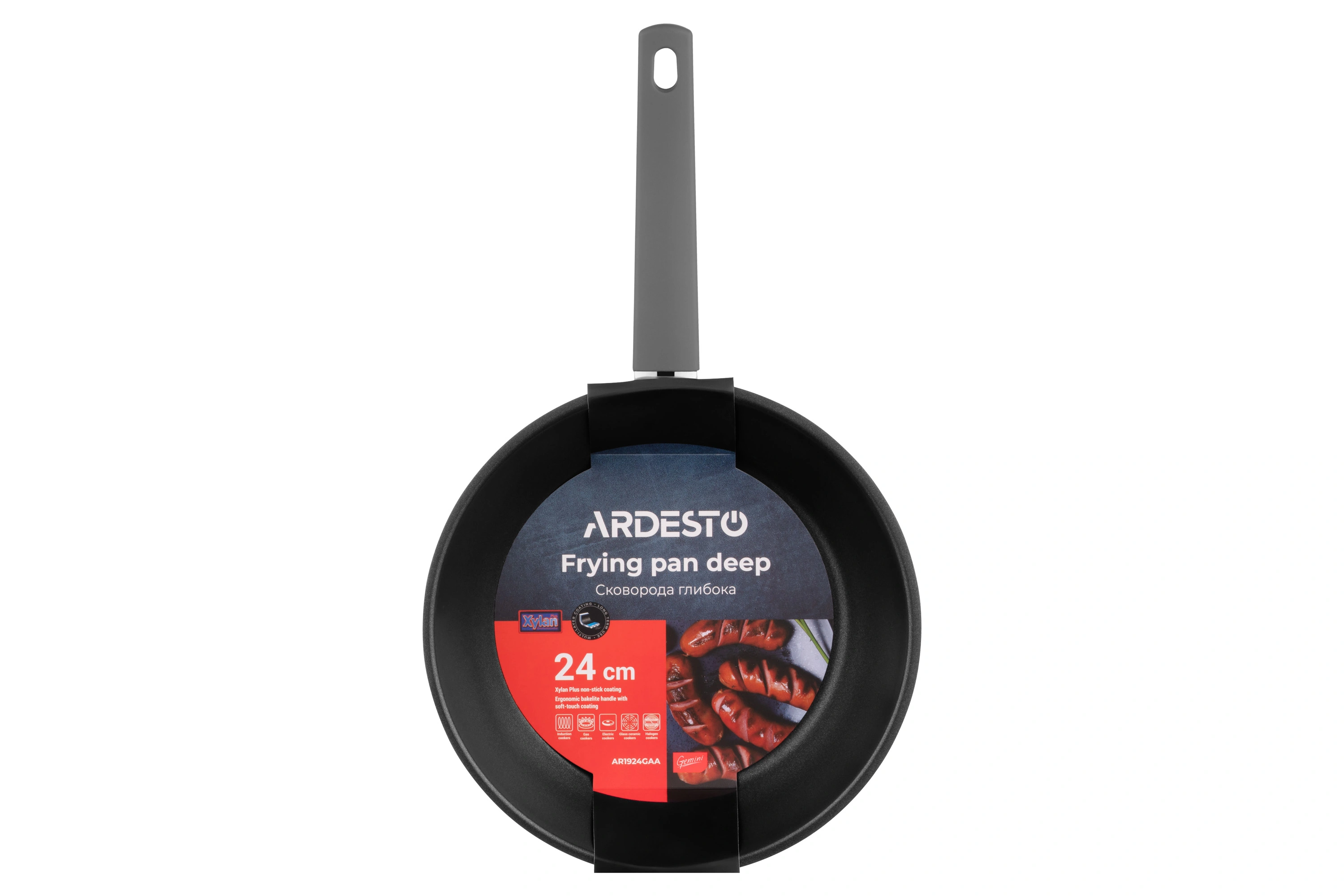 Глибока сковорода ARDESTO Gemini діаметром 24 см виготовлена з нержавіючої сталі. Товщина стінок і дна дещо різниться – 0,6 і 3 мм відповідно. Ергономічне бакелітове руків’я має soft-touch-покриття, а внутрішня поверхня виробу – протипригарне (Xylan Plus). З огляду на використані для виробництва матеріали сковороду не рекомендовано мити в посудомийній машині. Універсальність моделі зумовлена широкою сумісністю з різними видами плит: газовими, електричними, склокерамічними, індукційними й галогенними.