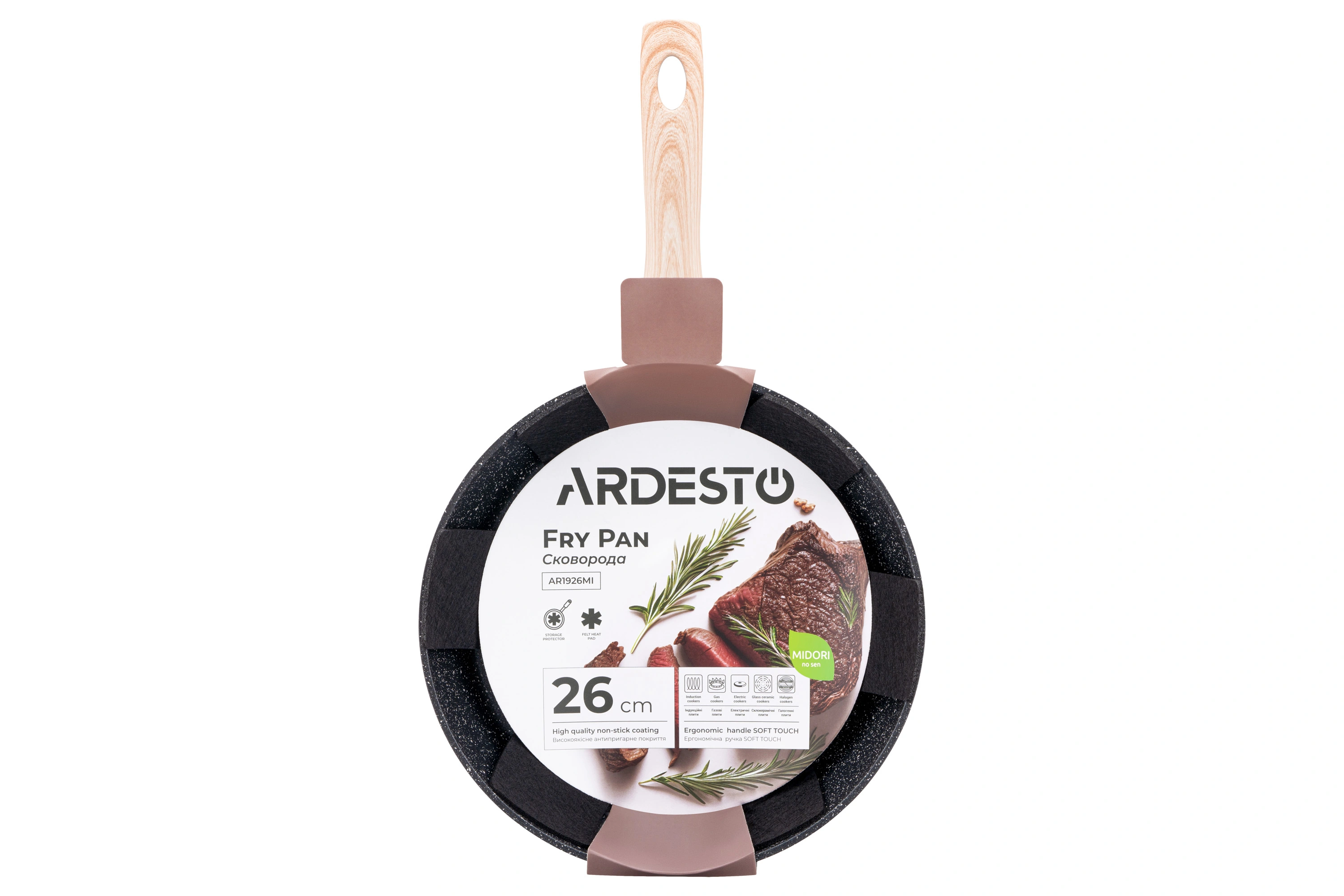 Сковорода ARDESTO Midori виготовлена з якісного алюмінію, завдяки чому забезпечується рівномірний розподіл тепла. Її діаметр становить 26 см за товщини стінок 2,3 мм. Сковорода має протипригарне мармурове покриття, що зумовлює можливість приготування страв із використанням мінімальної кількості олії.