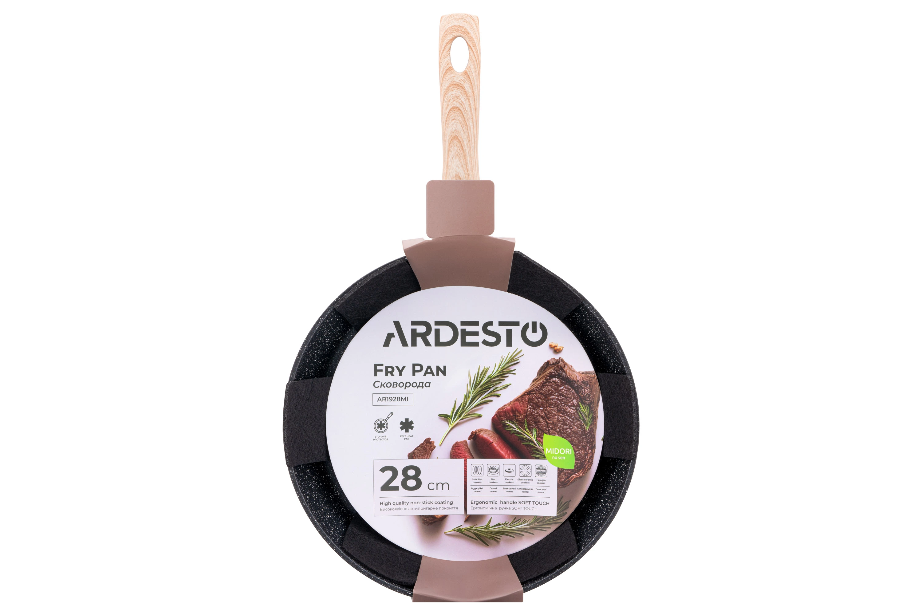 Сковорода ARDESTO Midori виготовлена з якісного алюмінію, завдяки чому забезпечується рівномірний розподіл тепла. Її діаметр становить 28 см за товщини стінок 2,3 мм. Сковорода має протипригарне мармурове покриття, що зумовлює можливість приготування страв із використанням мінімальної кількості олії.