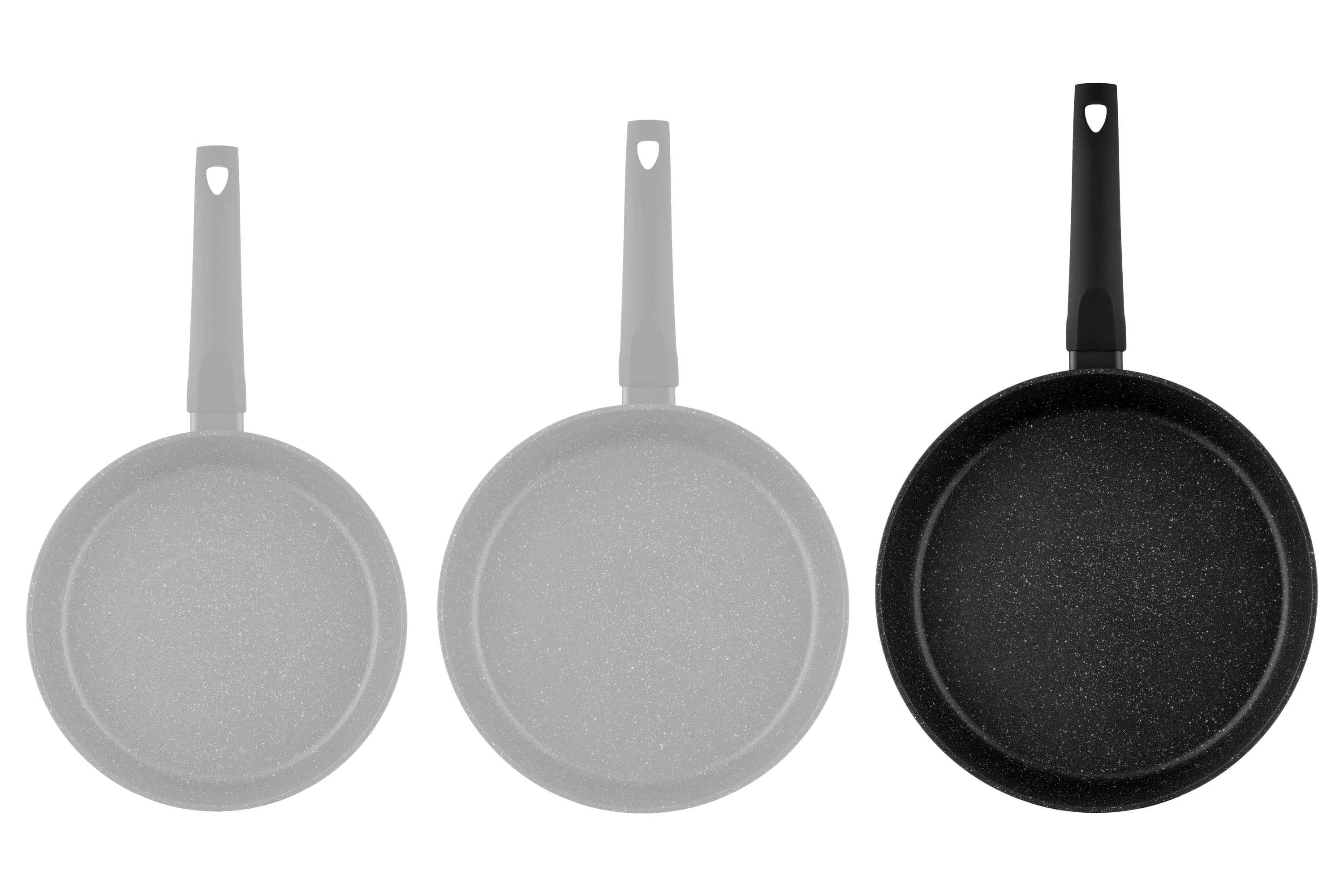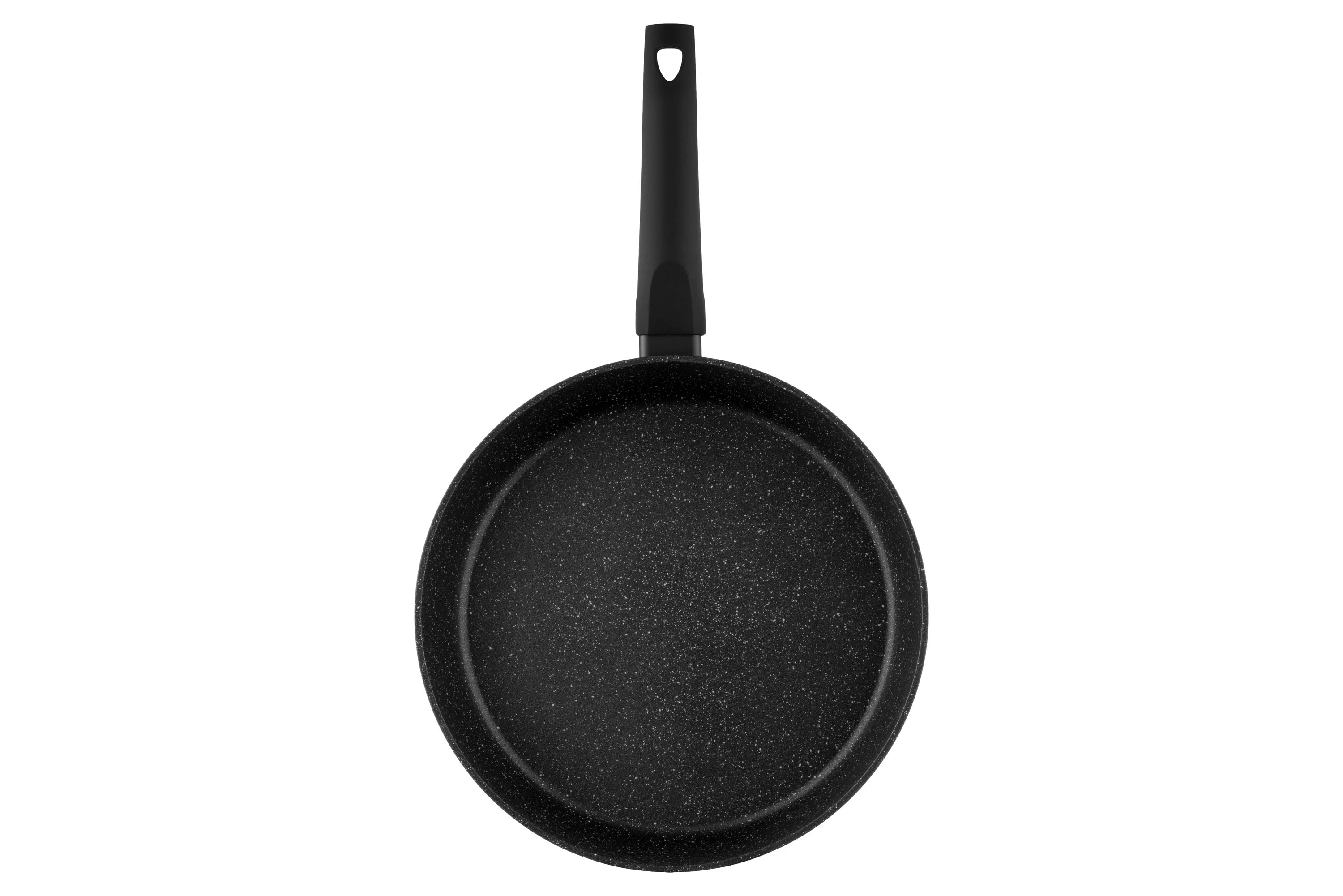 Сковороду виготовлено з кованого алюмінію, її діаметр – 28 см. За висоти 7 см товщина стінок становить 2,6/4 мм, а дна – 2,6 мм. Внутрішня поверхня має тришарове протипригарне покриття PFLUON, а бакелітове руків’я – soft-touch. З огляду на це виріб не рекомендовано мити в посудомийній машині.