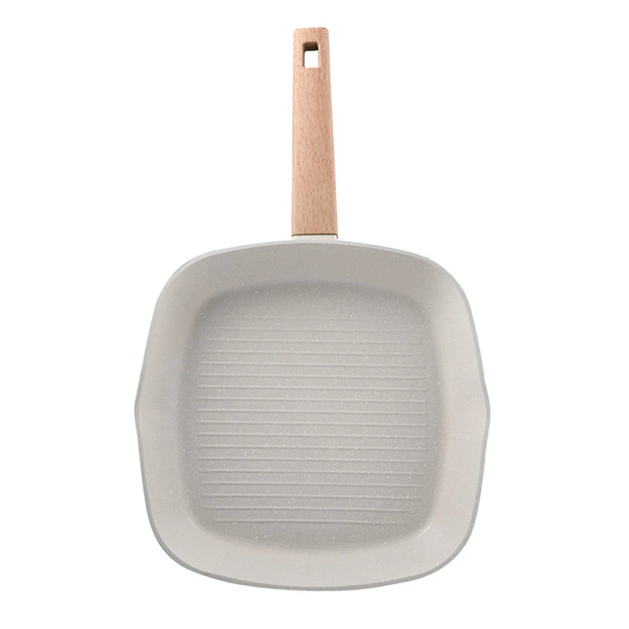 Біла сковорода-гриль Bergner Naturally BG-34743-CR квадратної форми та діаметром 28 см зроблена з кованого алюмінію, який сумісний практично з усіма видами плит, включаючи індукційні та галогенові. Усередині дно і стінки, стійкі до деформації, мають антипригарний шар, тому готувати на сковороді можна з мінімумом олії або без нього.