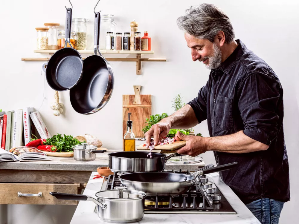 Обідки сковороди спеціально вигнуті для того, щоб комфортно переливати страви, уникаючи крапель та бризок. Виберіть здорове готування, оскільки ця сковорода не містить шкідливих речовин, таких як PFAS.