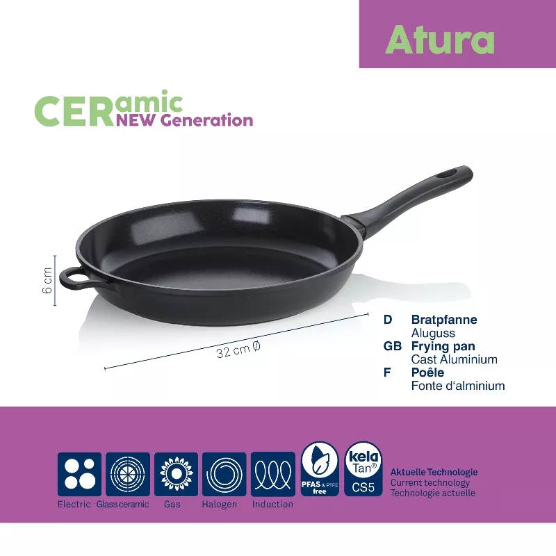 Керамічне покриття сковороди KELA Atura нового покоління без ПФАС (PFAS), термостійкість виробу до 250°C.