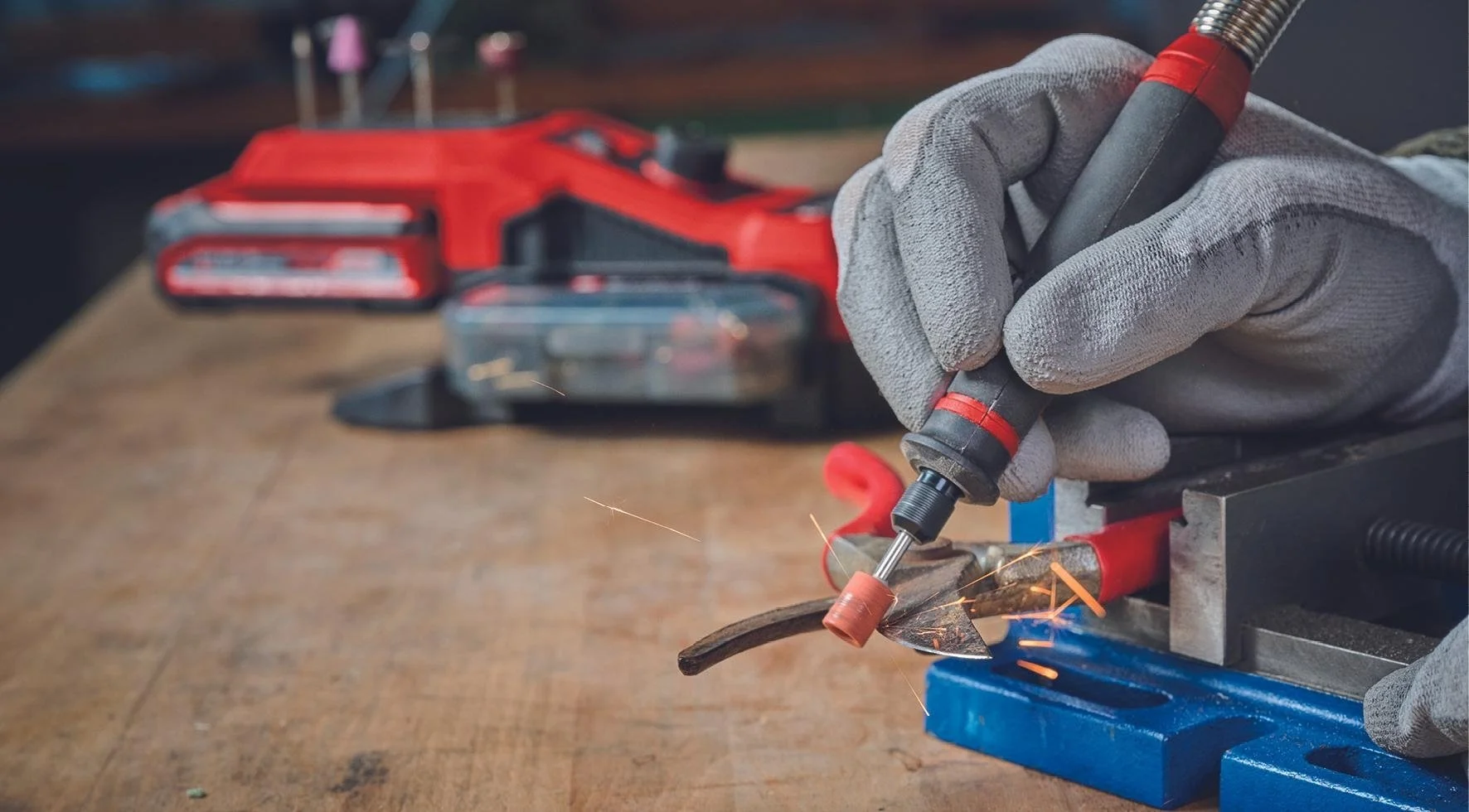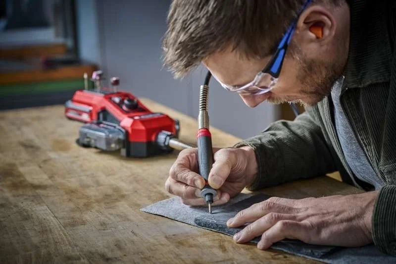 Акумуляторний шліфувально-гравірувальний інструмент лінійки Power X-Change system Einhell TE-MT 18/34 Li-Solo серії Expert - вірний помічник у виконанні різноманітних завдань, таких як гравірування, полірування, фрезерування, шліфування, різання та чищення. Електронний регулятор швидкості дозволяє змінювати оберти гравера від 5000 до 34000 об/хв, що дозволяє працювати з матеріалами різної щільності.