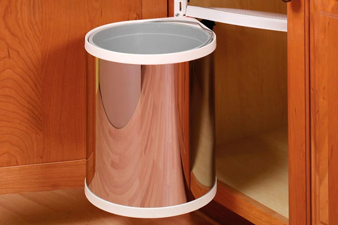Висувна конструкція встановлюється у нижній шафці кухні. Інколи сміттєвий контейнер монтується у кутовій секції. Він робить кухню практичною. Контейнер забезпечує комфорт і доповнює дизайн.