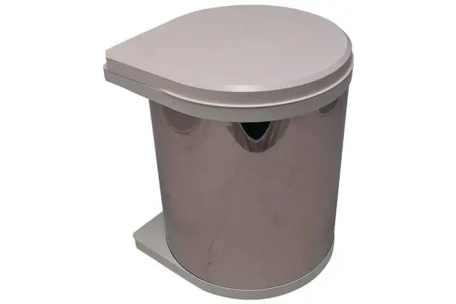 Сміттєвий контейнер, ємністю 15 л призначений для корпусу шириною від 400 мм, монтується за поворотними дверима. Контейнер виготовлений з нержавіючої сталі. Змінне відро пластмасове, світло-сірого кольору, кришка біла. Загвинчується зліва і справа до бічної стінки шафи. Розміри: 290 х 304 х 365 мм.