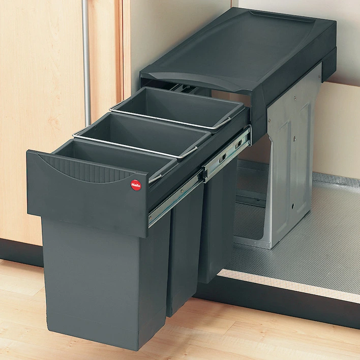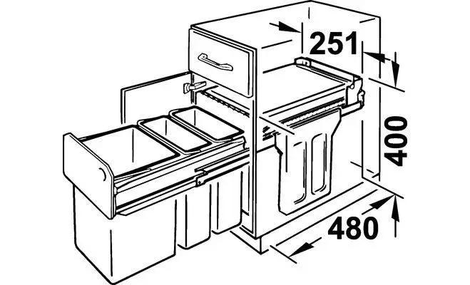 Завдяки спеціальному механізму сміттєзбірник може бути закріплений в будь-яких кухонних меблях або до підлогового покриття, наприклад, під мийкою. Висувний механізм плавний і зручний, що дозволяє без труднощів виїхати контейнерам сміттєзбірника. Така модель встановлюється без особливих зусиль. З подібною конструкцією процес утилізації відходів буде здійснюватися максимально комфортно.
