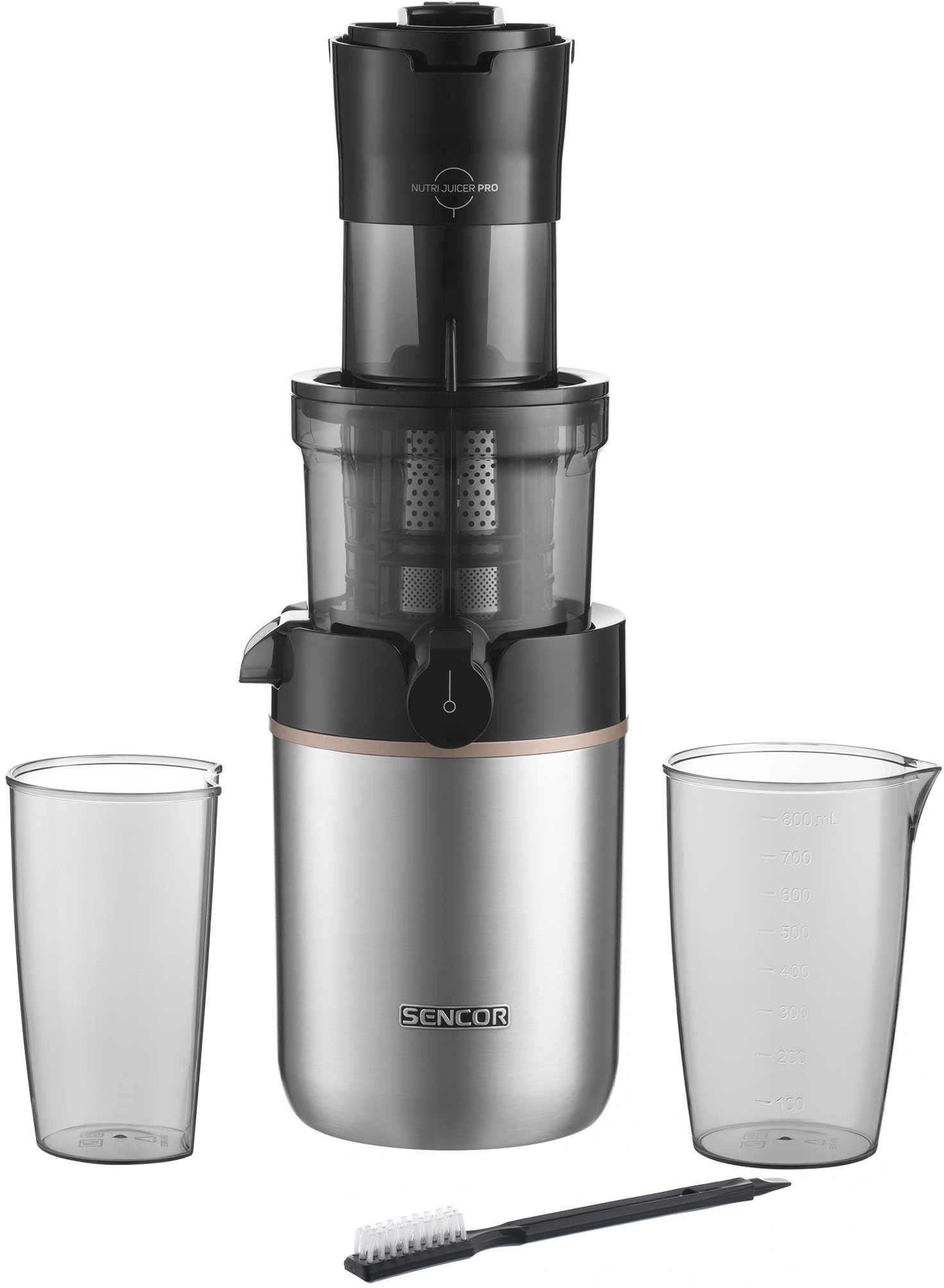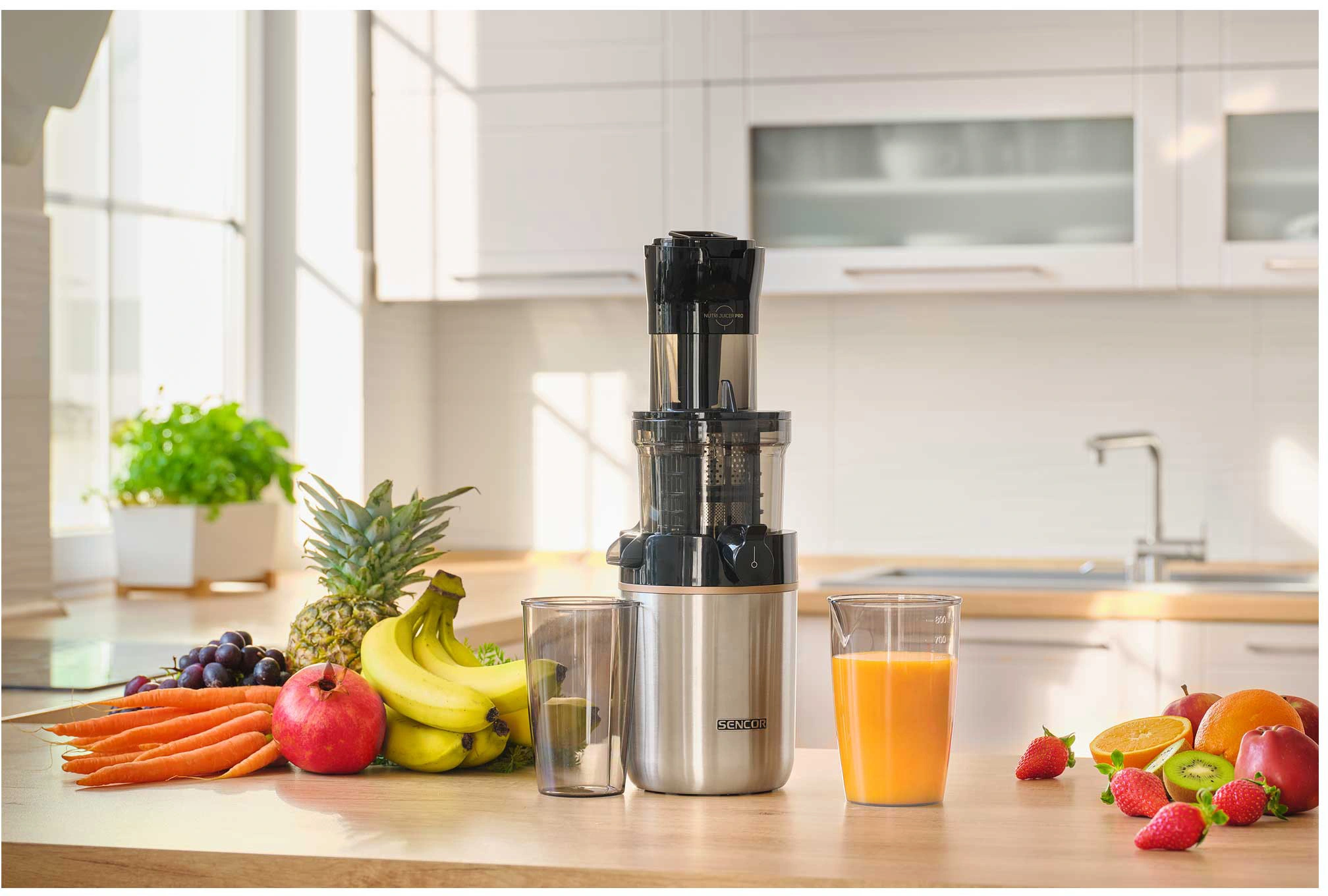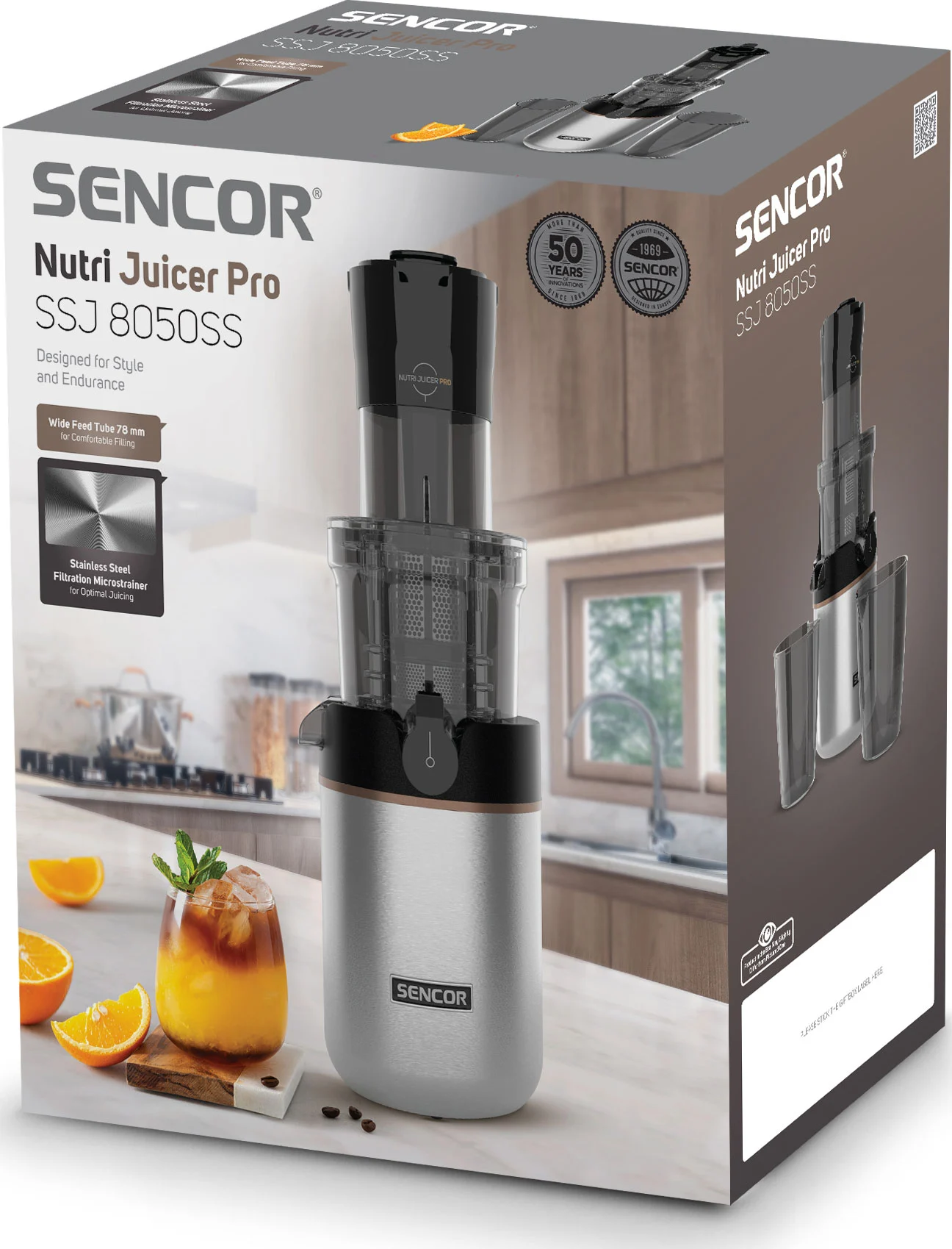 Соковитискач Sencor SSJ8050SS із широким жолобом, двошвидкісною роботою та корпусом із нержавіючої сталі забезпечує ефективне віджимання соку з високим вмістом соку (до 75%). Оснащений двигуном постійного струму, функцією реверсу, системою DripStop і комплектується ємностями для соку та м’якоті, штовхачем і щіткою для очищення.