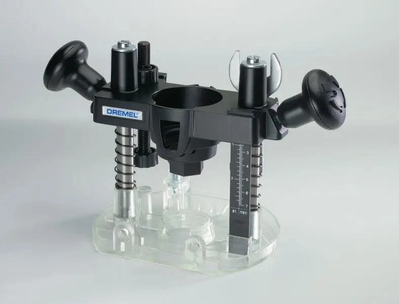 Перетворює Ваш інструмент Dremel у фрезерний верстат, який може фрезерувати по колу, гравірувати символи і виконувати інкрустацію, виготовляти декоративні кромки, а також фрезерувати паралельно кромці. Упор глибини в рукоятці - просто поверніть рукоятку для блокування / розблокування. Два обмежувача глибини для швидкої і послідовної регулювання глибини. Напрямна кромки і спрямовуюча окружності для фрезерування по прямій і виготовлення точних за формою кіл. Комплект напрямних втулок для фрезерування букв і зображень за шаблоном.