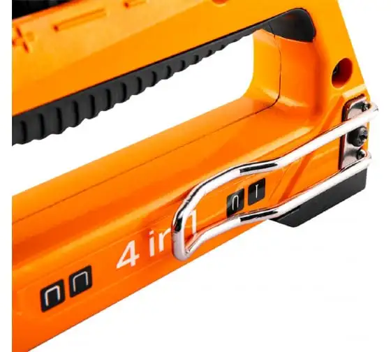 Степлер меблевий, багатофункціональний, 4 в 1, скоби 6-14 мм, для скоб типу J, G, L, E, корпус з алюмінію, профільована ручка, покрита пластиком, регульоване зусилля притиску скоб, простий вибір типу скоб за допомогою слайдера, затискач для кріплення на пояс, замок безпеки