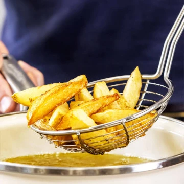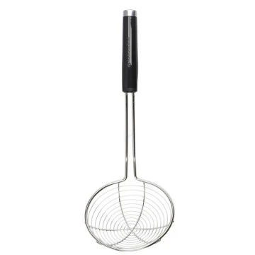 Універсальна шумівка KitchenAid — незамінний помічник на кухні. Широка основа з нержавіючої сталі, стійкої до іржі, дозволяє рідині швидко стікати, що робить шумівку ідеальним інструментом для смаження у фритюрі або використання з сковородою вок. На блискучій ручці вигравіруваний логотип, а також є сатинована хромована підставка та петля для підвішування. Для легкого очищення цей інструмент можна мити в посудомийній машині.
