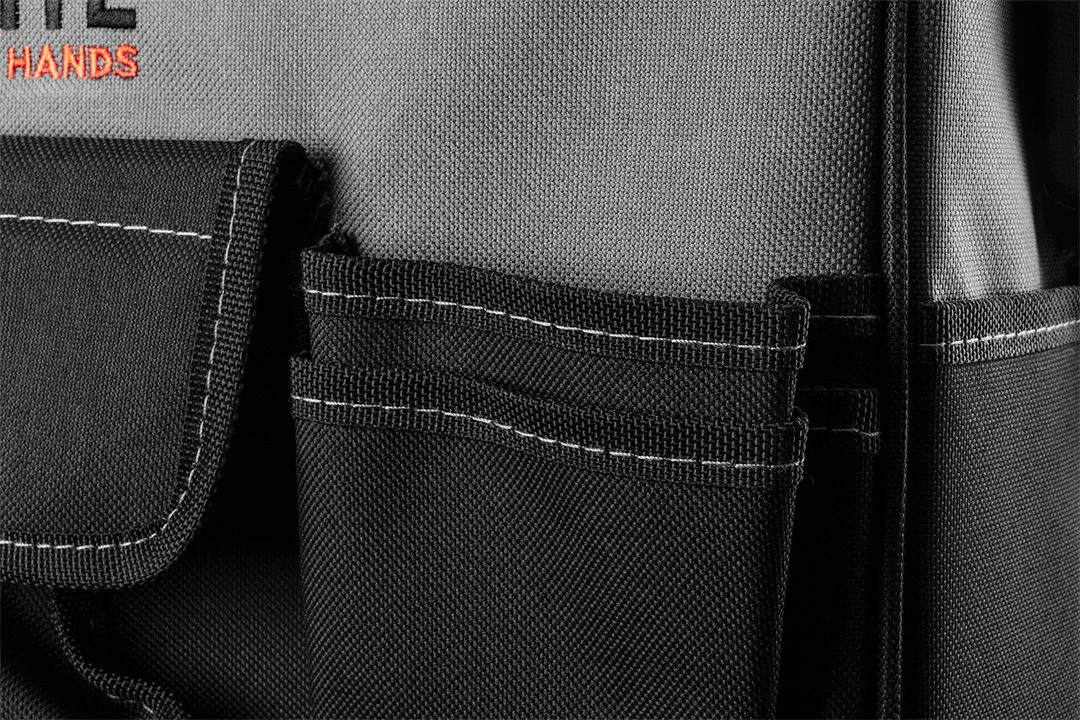 Сумка для середнього електроінструменту Energy+ GRAPHITE об'ємом 18,5 л виготовлена з поліестеру. Сумка оснащена 8 внутрішніми кишенями, 2 внутрішніми гачками для інструментів та 7 зовнішніми кишенями, що дозволяє впорядкувати інструменти та безпечно їх транспортувати.