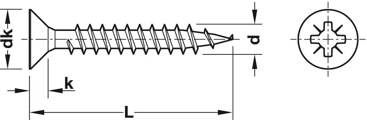 Шуруп для ДСП з повною різьбою і потайною голівкою, виготовлений з оцинкованої сталі. Параметри шурупа (мм): привід / діаметр різьби/довжина/діаметр голівки/висота голівки -хрестовий шліц PZ1/2,5/16/5,0/1,6 мм. Шурупи постачаються в упаковці Orga Box у кількості 1000 шт.
