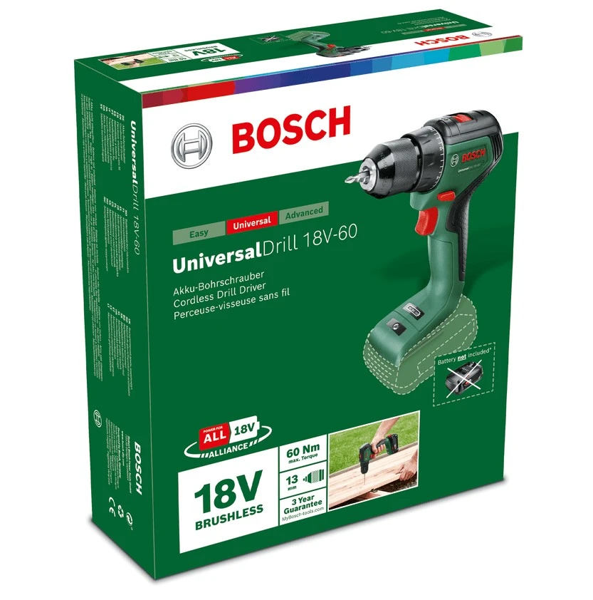 Міцність і висока продуктивність в одному – модель Bosch UniversalDrill 18V-60 забезпечує потужність, точність і легке свердління в деревині, металі та пластмасі, а також легке загвинчування. Завдяки універсальності, 20 діапазонам крутного моменту та 2-швидкісному редуктору, технологія безщіткових двигунів гарантує вищу продуктивність дриля і триваліший час роботи. Високоякісний і надійний 13-міліметровий металевий патрон забезпечує надійну фіксацію насадок і їх легку заміну. Інструмент входить до POWER FOR ALL ALLIANCE, що дозволяє використовувати один акумулятор для живлення багатьох інструментів різних марок.