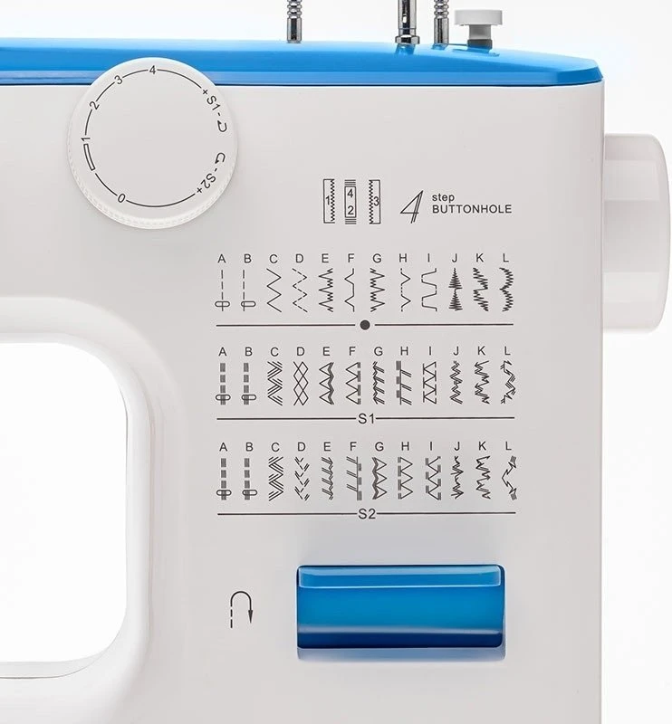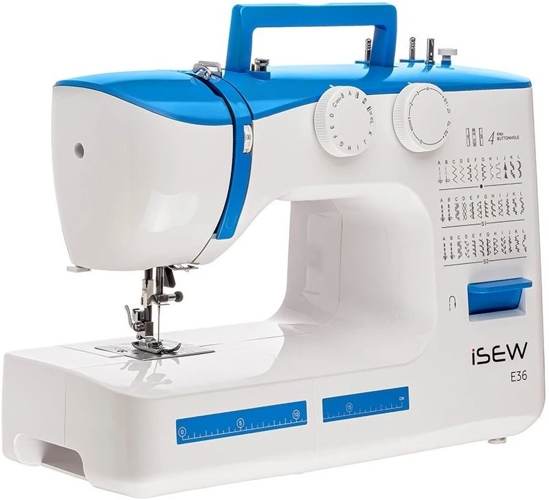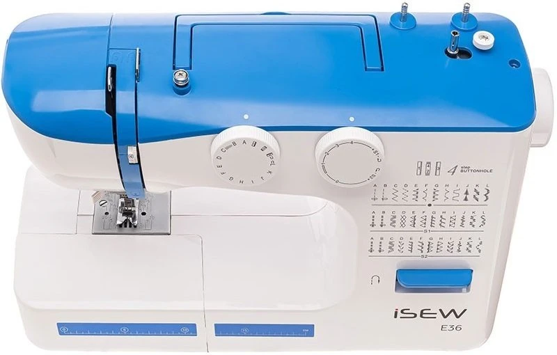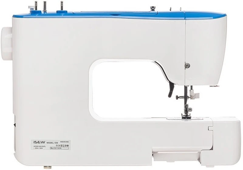 Швейна машина iSEW E36, електромех., 62Вт, 36 шв.оп., петля напівавтомат, білий+синій. Електромеханічна швейна машина iSew E36 з набором з 36 швейних програм, серед яких еластичні, оверлочні, потайні, робочі та декоративні строчки, а також виконання за 4 кроки петлі в напівавтоматичному режим. Комфортність роботи на цій моделі забезпечується можливістю плавного регулювання довжини стібка до 4 мм та ширини строчки до 5 мм.