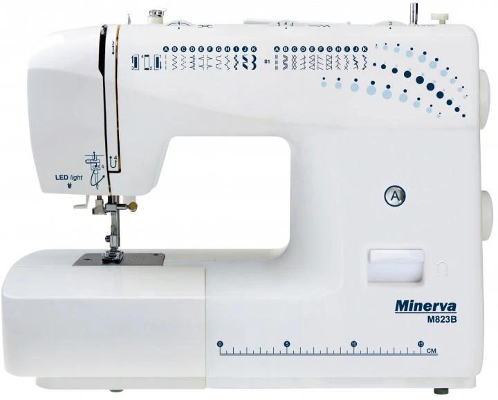 Швейна машина МINERVA M823B, 26 швейних операцій, 85 Вт, петля напівавтомат, білий-синій. Прошиваючі матеріали: для трикотажу. Застосування: Побутові. Кількість типів строчек: 22. Вертикальний човниковий пристрій. Робочі операції, еластичні строчки для трикотажних тканин, декоративна і фестонна вишивки, оверлочні строчки, потайна підшивка низу. Плавне регулювання довжини стібка. Автоматичний нитковтягувач.