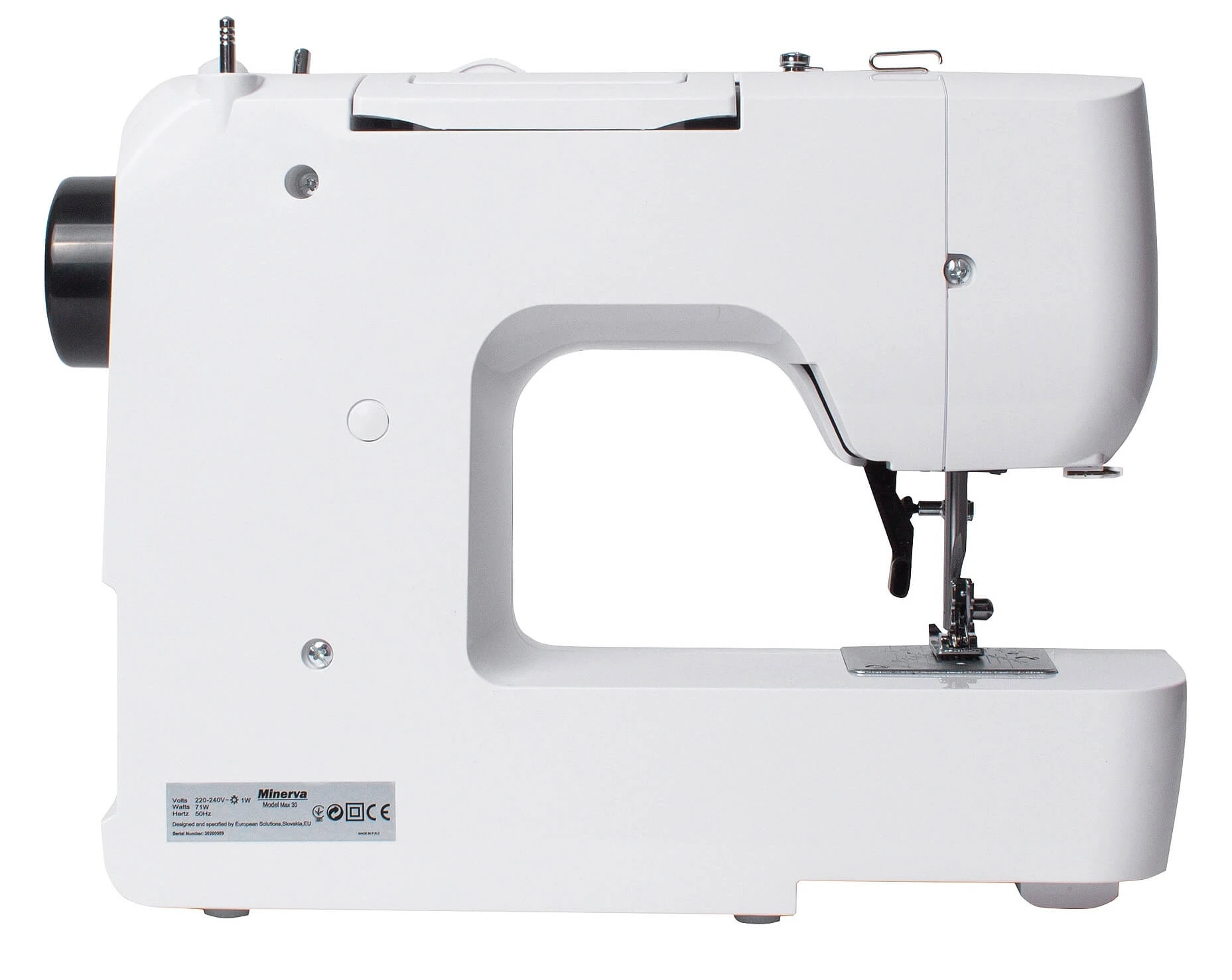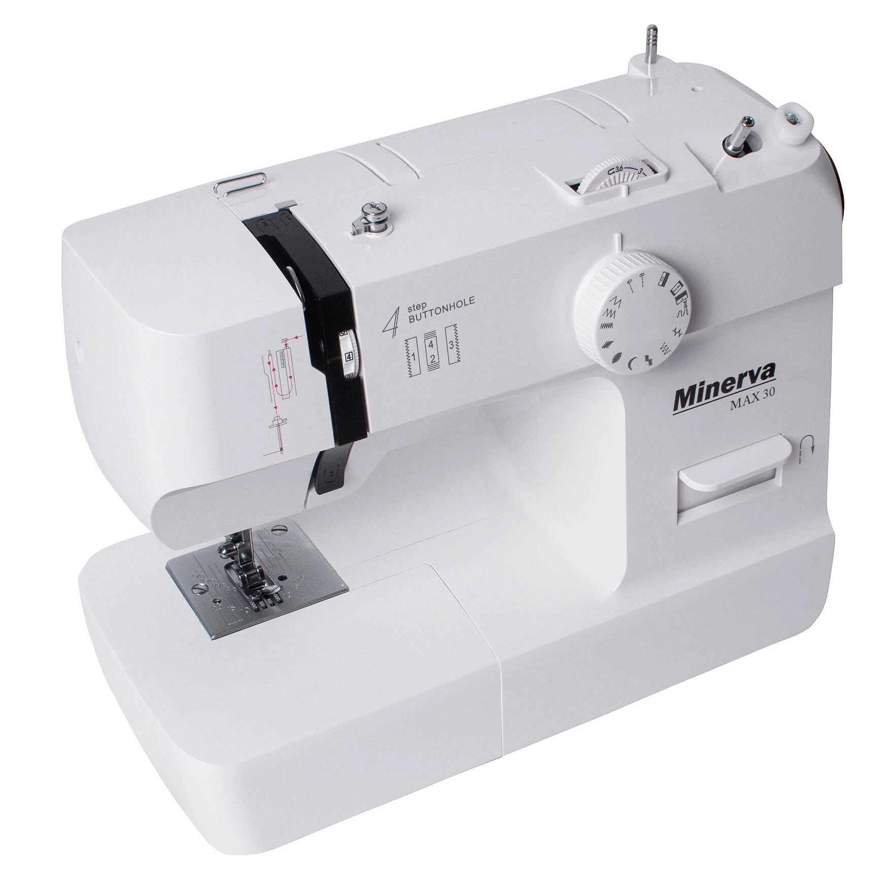 MINERVA Max 30 - нова практична модель швейної машинки компактної серії, оснащена класичним вертикальним човниковим пристроєм і яскравим світлодіодним підсвічуванням. Призначена для шиття і ремонту одягу. Виконує 13 видів строчок. Висока потужність, як для швейних машин компактної серії гарантує високу якість шиття на цупких тканинах.