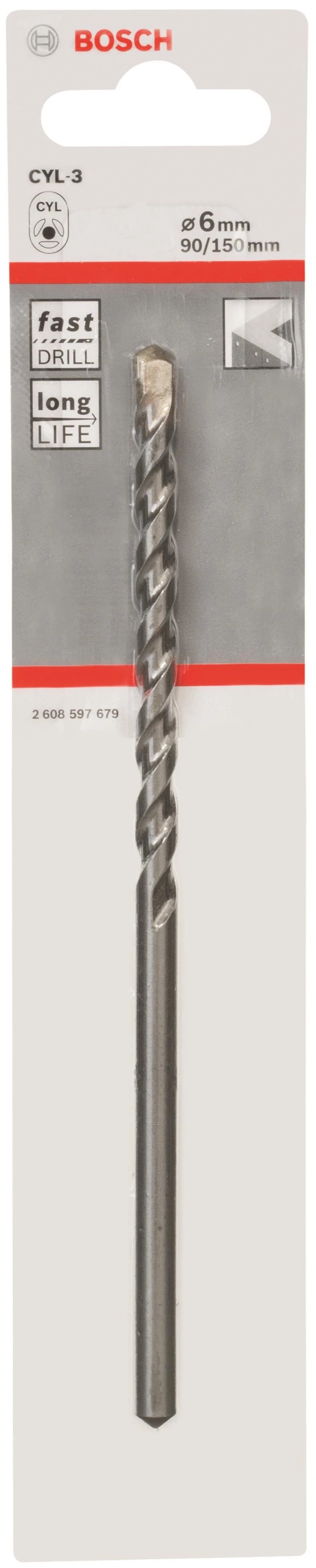 Cверло по бетону CYL-3 SilverPercussion з парою ріжучих крайок Standard. U-подібна форма двох спіралей відмінно виводить пил. Свердло Bosch CYL-3 2.608.597.679 призначене для роботи з бетоном та іншими абразивними матеріалами. Його діаметр складає 6 мм, робоча довжина – 90 мм, а загальна – 150 мм. Це свердло оптимально підходить для ударних та безударних дрилів завдяки універсальному циліндричному хвостовику, сумісному з трьохкулачковими патронами.
