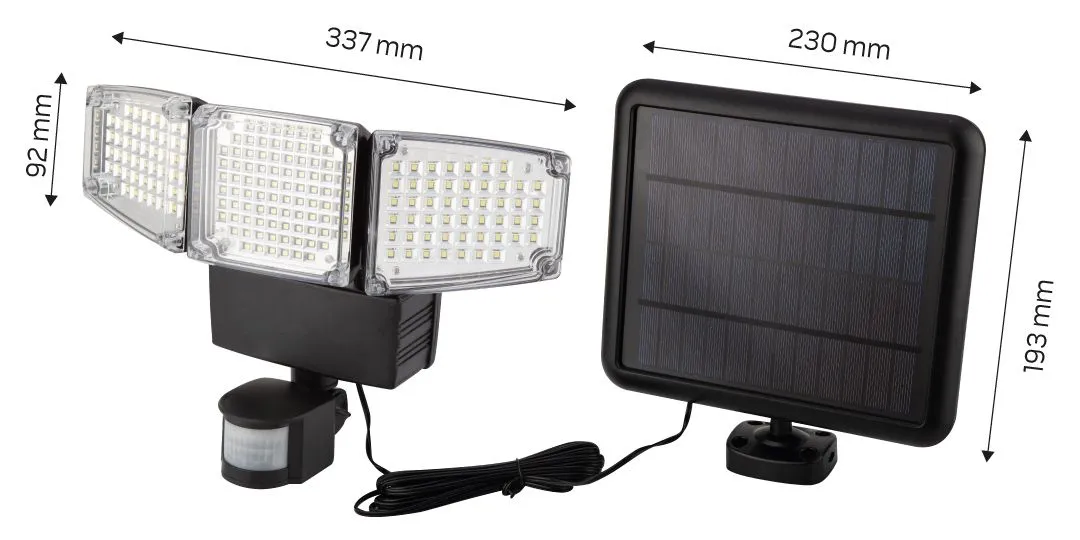 Потрійний світлодіодний настінний світильник на сонячній батареї 1000 лм 99-089 NEO освітить дорогу до будинку, саду, фасаду магазину або господарських будівель. Він складається з трьох світлодіодних панелей, що випромінюють 1000 лм. Така кількість світла освітлює нерівності поверхні або покращує роботу моніторингу. Оснащений датчиком руху та великою дальністю спрацьовування – до 10 м та на кут 100 градусів. Дві вбудовані акумуляторні батареї можуть працювати протягом 6 годин безперервно з включеною функцією постійного освітлення або уривчасто, для освітлення з датчиком руху. Сонячна панель потребує близько 6-8 годин сонячної енергії, поки вона не буде повністю заряджена.