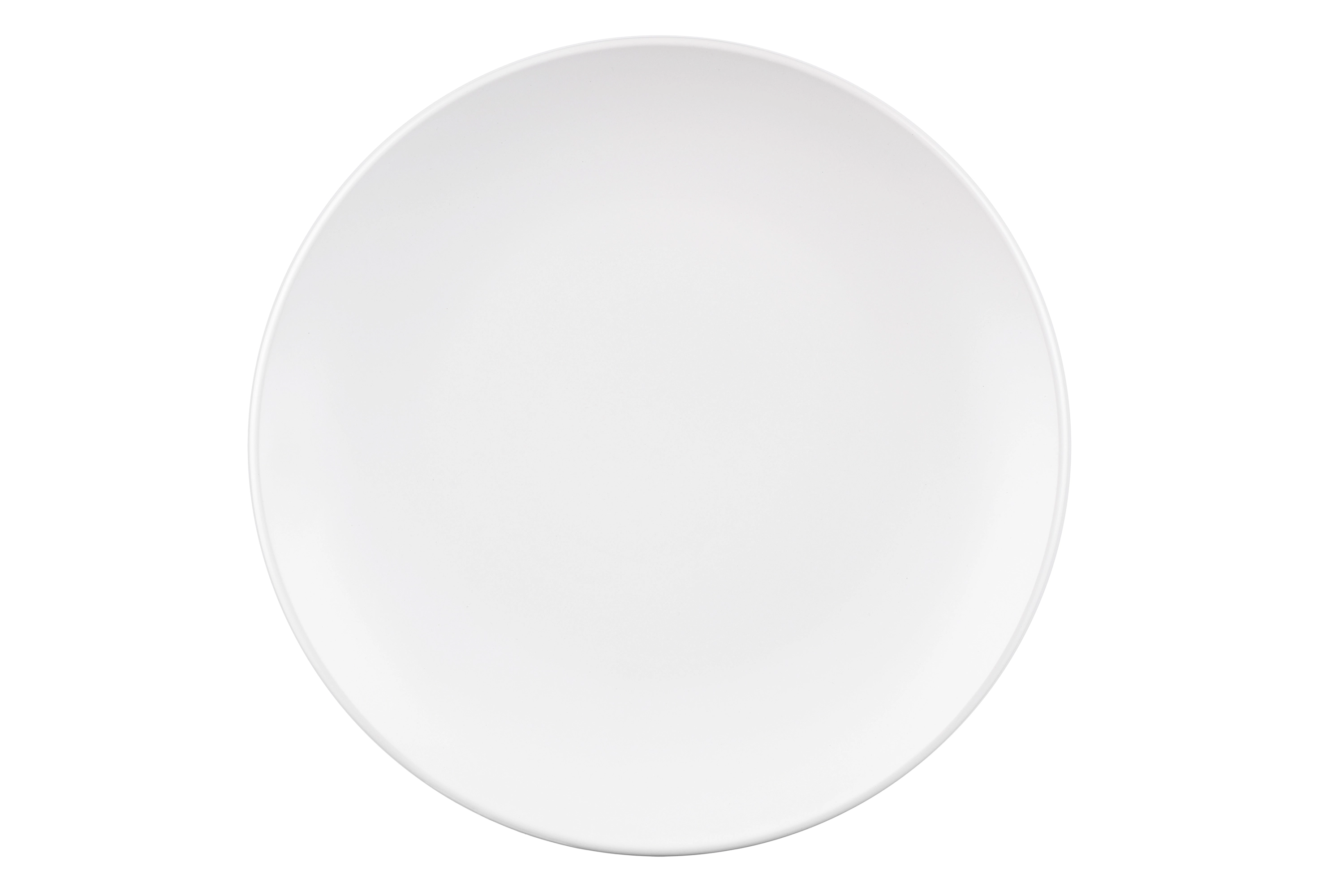 Біла обідня тарілка діаметром 26,5 см. Виготовлено з екологічно чистого матеріалу. Можна мити в посудомийній машині та використовувати в мікрохвильовій печі.