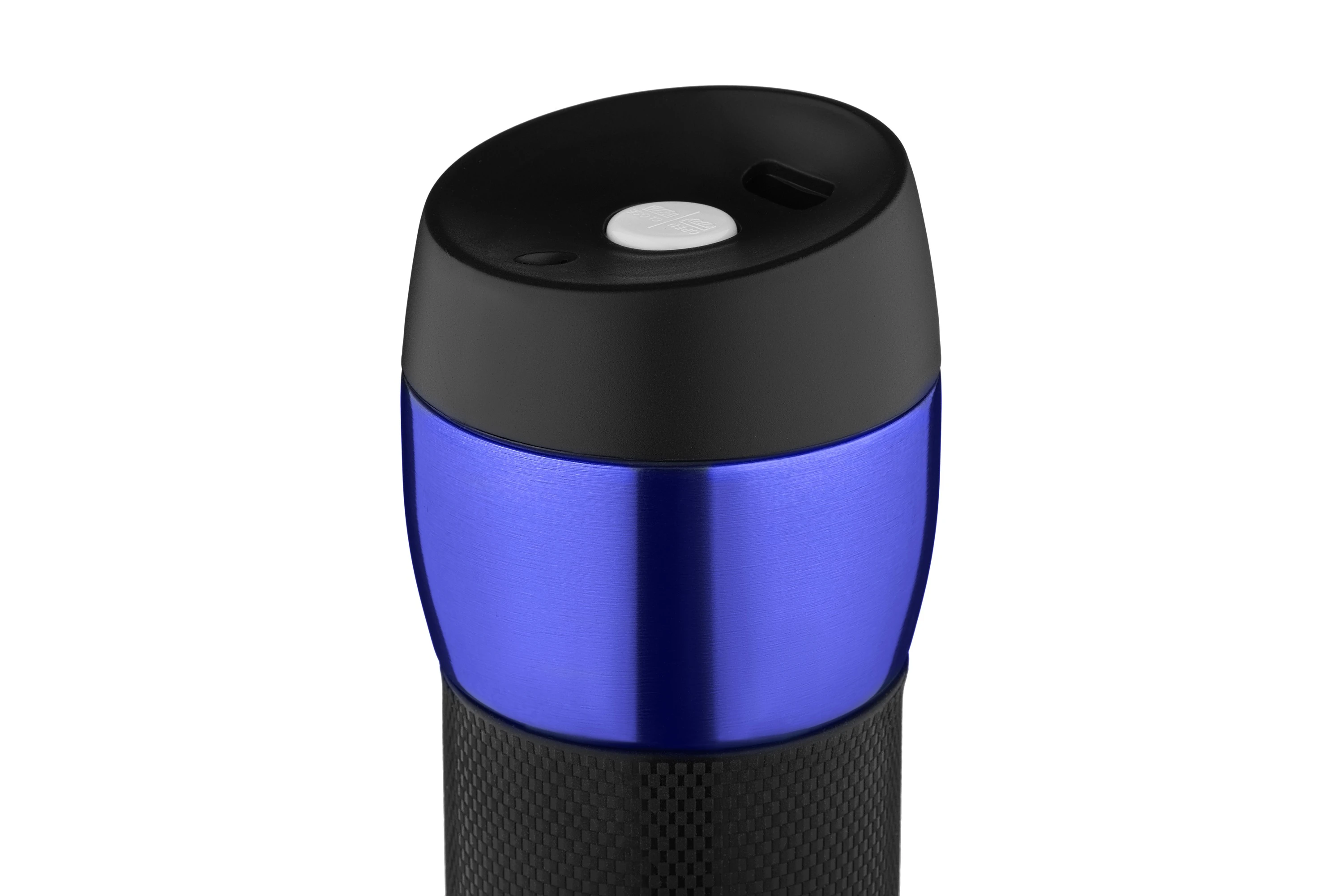 Термочашка на 450 мл з вакуумною технологією зберігання температури – до 8 годин для гарячих напоїв, та 12 годин для холодних. Зовнішня металева частина пофарбована у синій  колір з глянсовою текстурою. Для зручності передбачено силіконове покриття під долоню. Внутрішня частина виконана з нержавіючої сталі 18/10. Нековзка основа запобігає перевертанню, а пластикова кришка отримала силіконову прокладку та кнопку відкриття отвору для пиття.