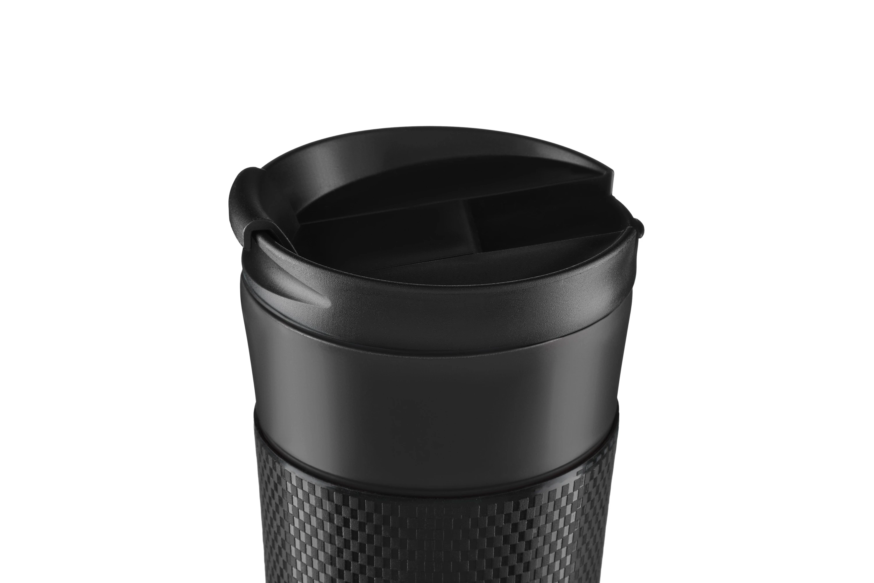 Термочашка на 450 мл з вакуумною технологією зберігання температури – до 8 годин для гарячих напоїв, та 12 годин для холодних. Зовнішня металева частина пофарбована у чорний колір з матовою текстурою. Для зручності передбачено силіконове покриття під долоню. Внутрішня частина виконана з нержавіючої сталі 18/10. Нековзка основа запобігає перевертанню, а пластикова кришка отримала силіконову прокладку та відкидну заглушку.