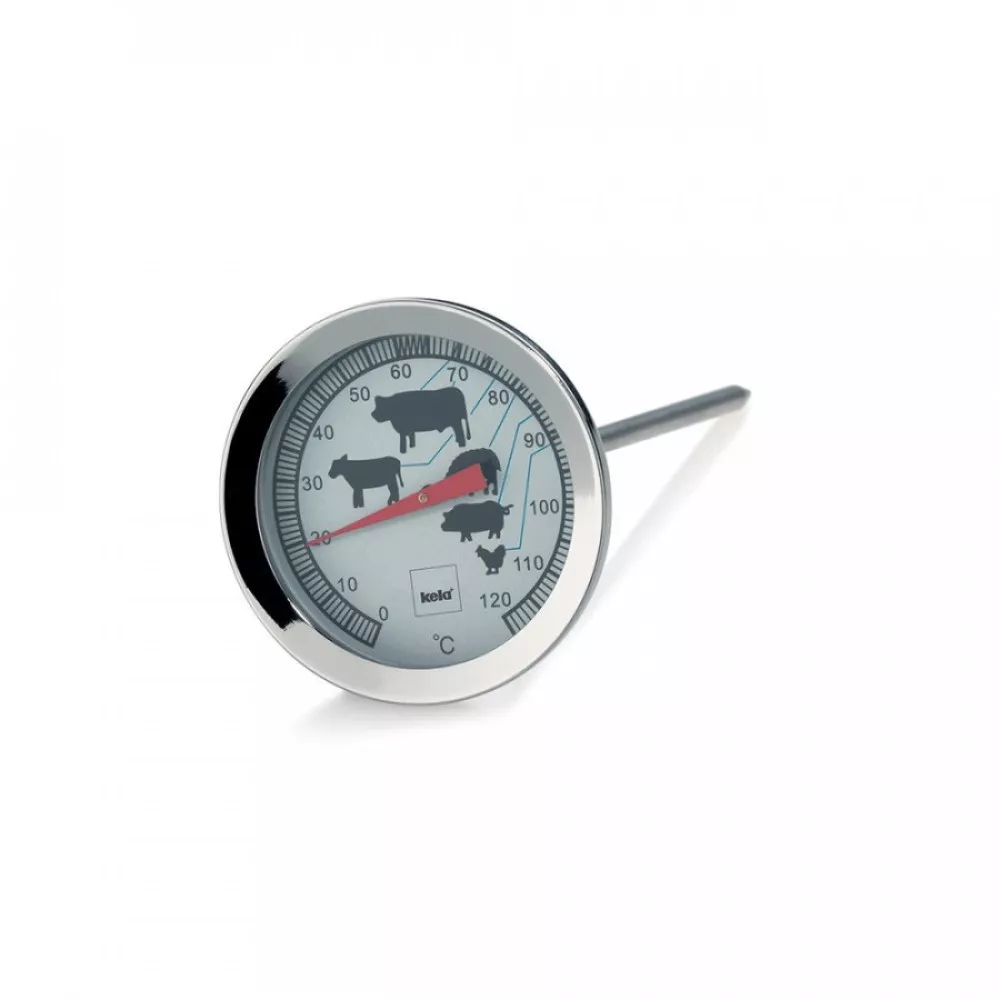 Німецький виробник посуду та приладдя для кухні KELA, представляє для всіх любителів готувати м'ясо, термометр для м'яса KELA PUNKTO. Термометр виготовлений з нержавіючої сталі. Після занурення в м'ясо чітко видимий червоний покажчик вказує температуру всередині. На термометрі зазначена інформація про рекомендовану температуру для різних видів м'яса. Шкала відображає температуру від 0 °С до 120 °С. Підходить як для професійних кухарів, так і для домашнього застосування.