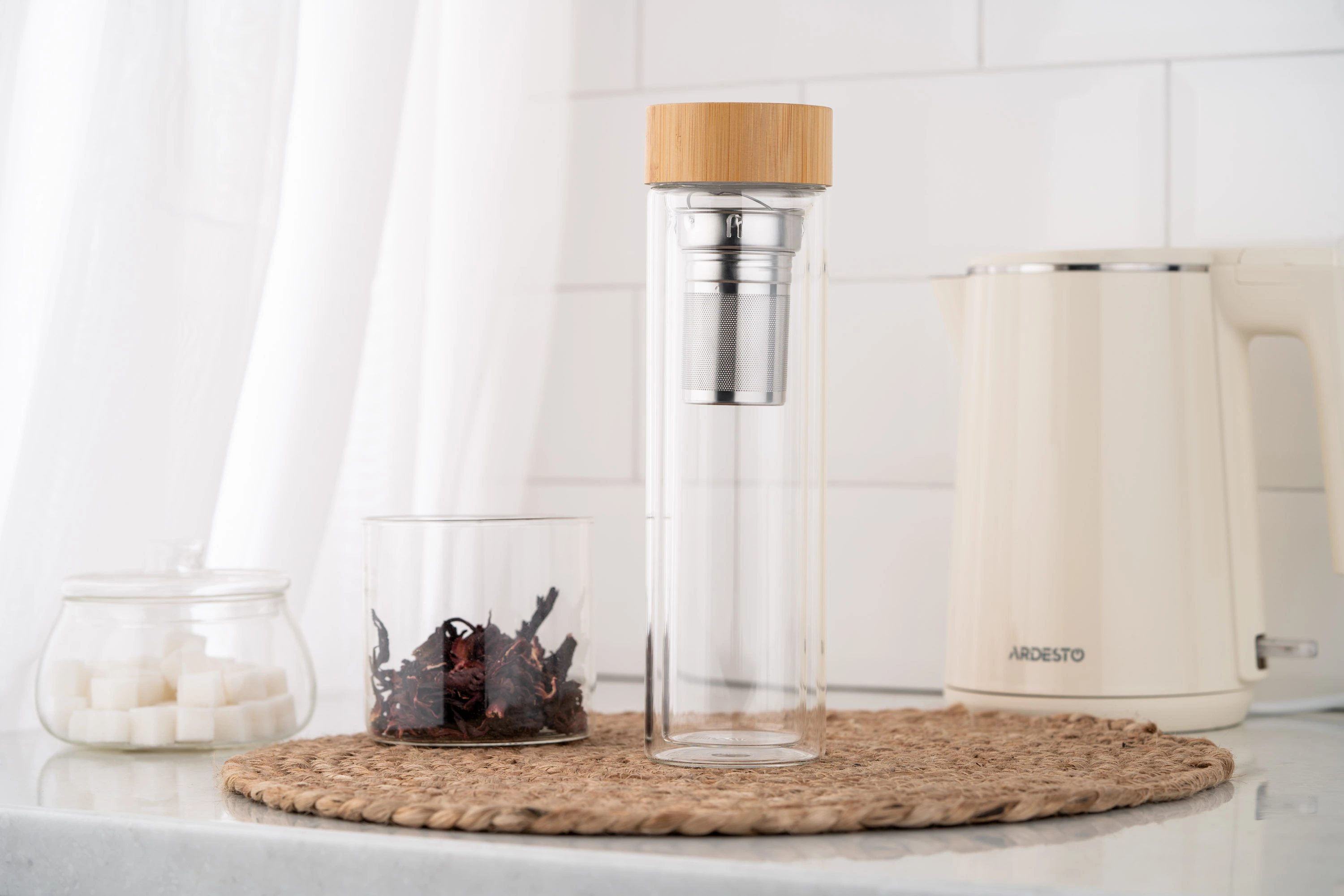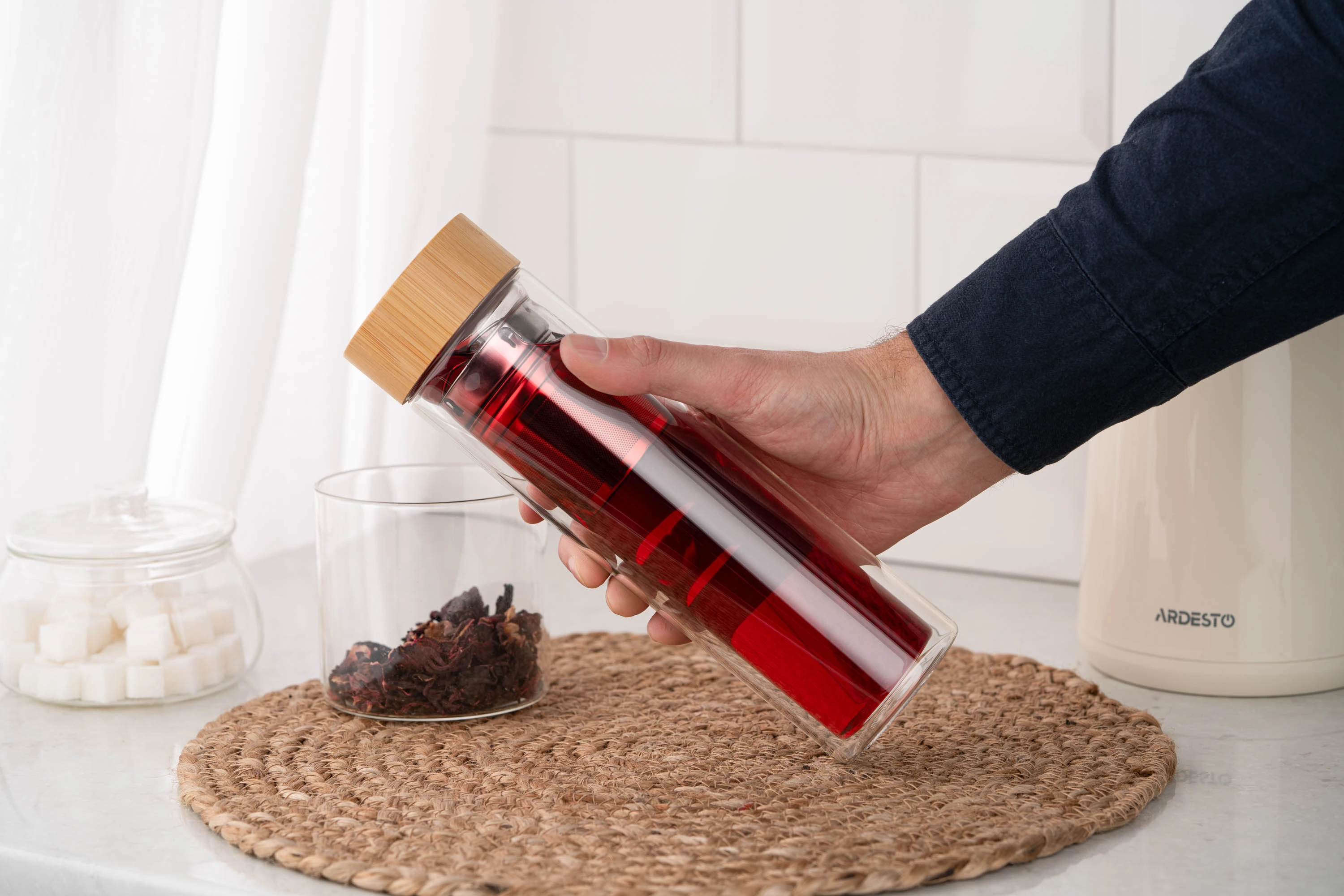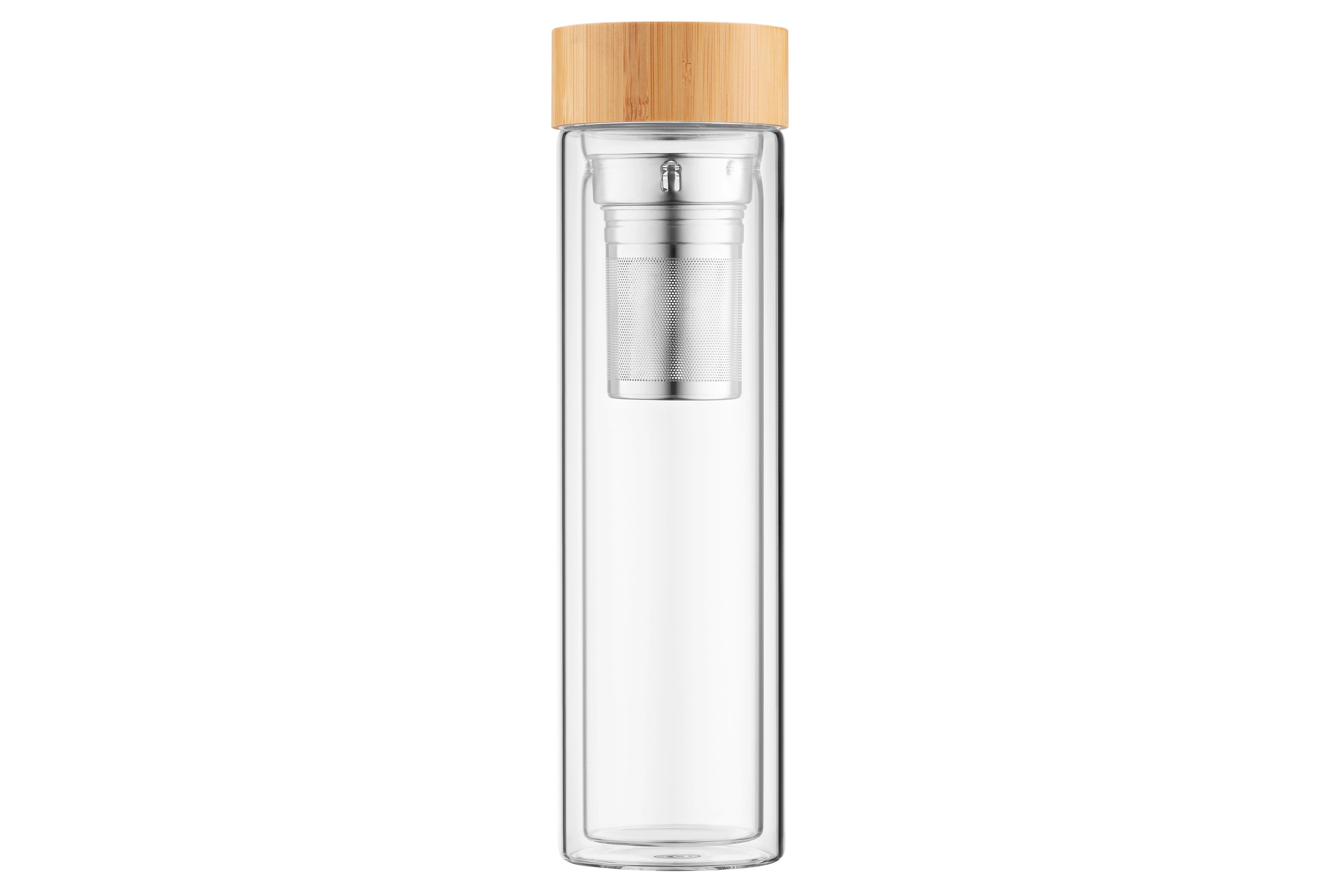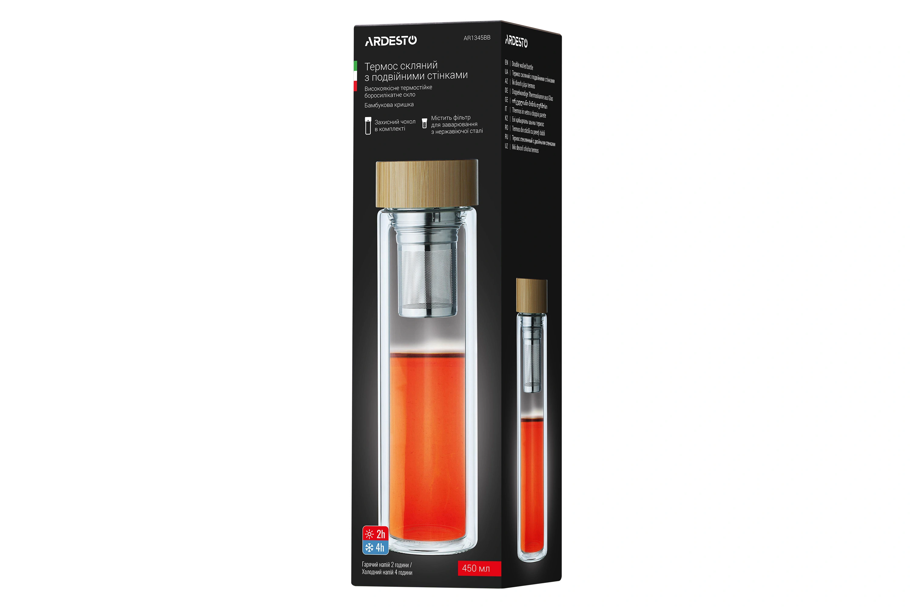 Вироблений із боросилікатного скла, термос із подвійними стінками ARDESTO об’ємом 450 мл підтримує оптимальну температуру улюбленого напою – як холодного, так і гарячого – упродовж 2 год. Ситечко з нержавіючої сталі забезпечує можливість легко заварювати чай прямо в термосі, а бамбукова кришка додає ноток природної елегантності. Діапазон термостійкості – від -20 до +150 °C, до того ж термос придатний до миття в посудомийній машині.