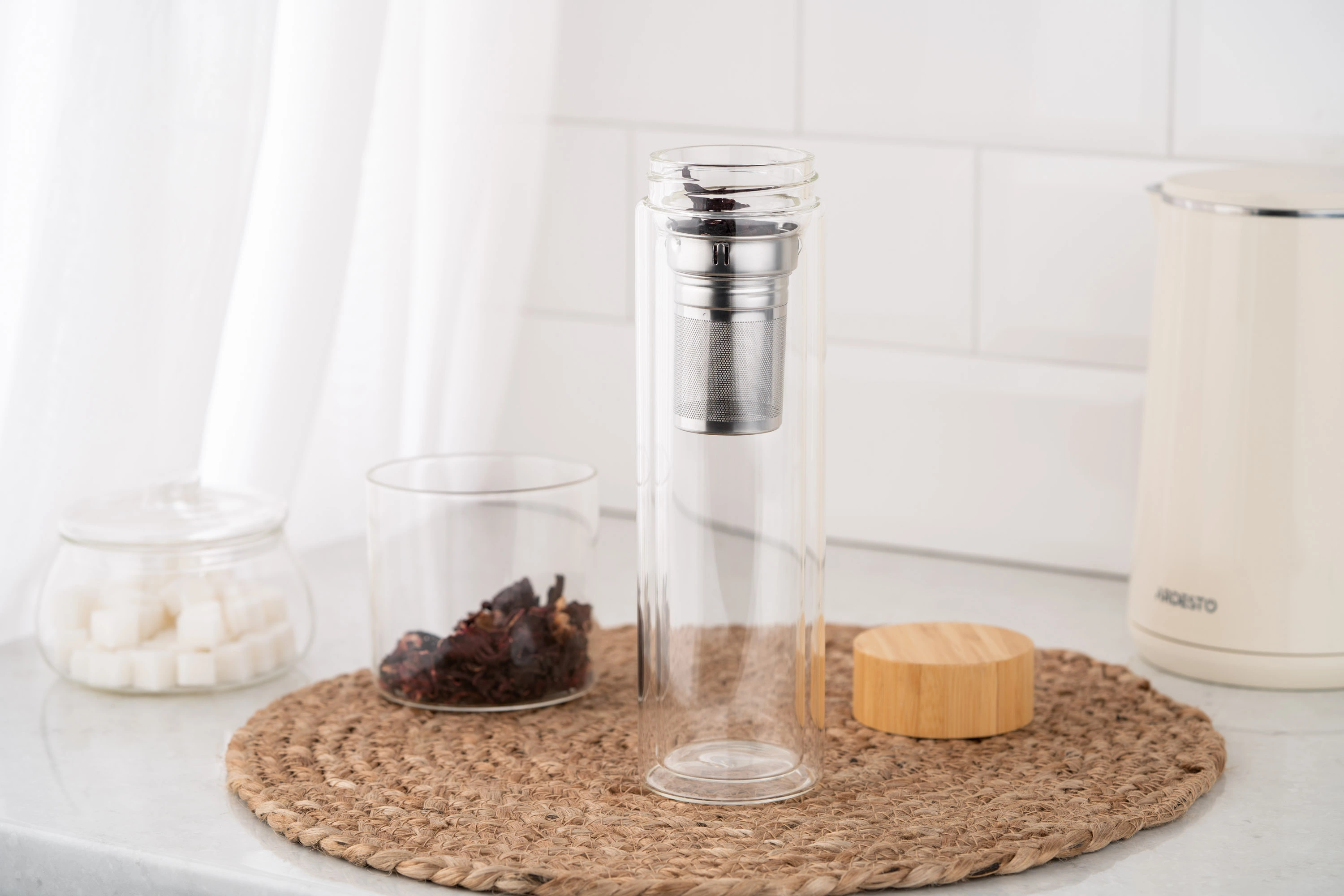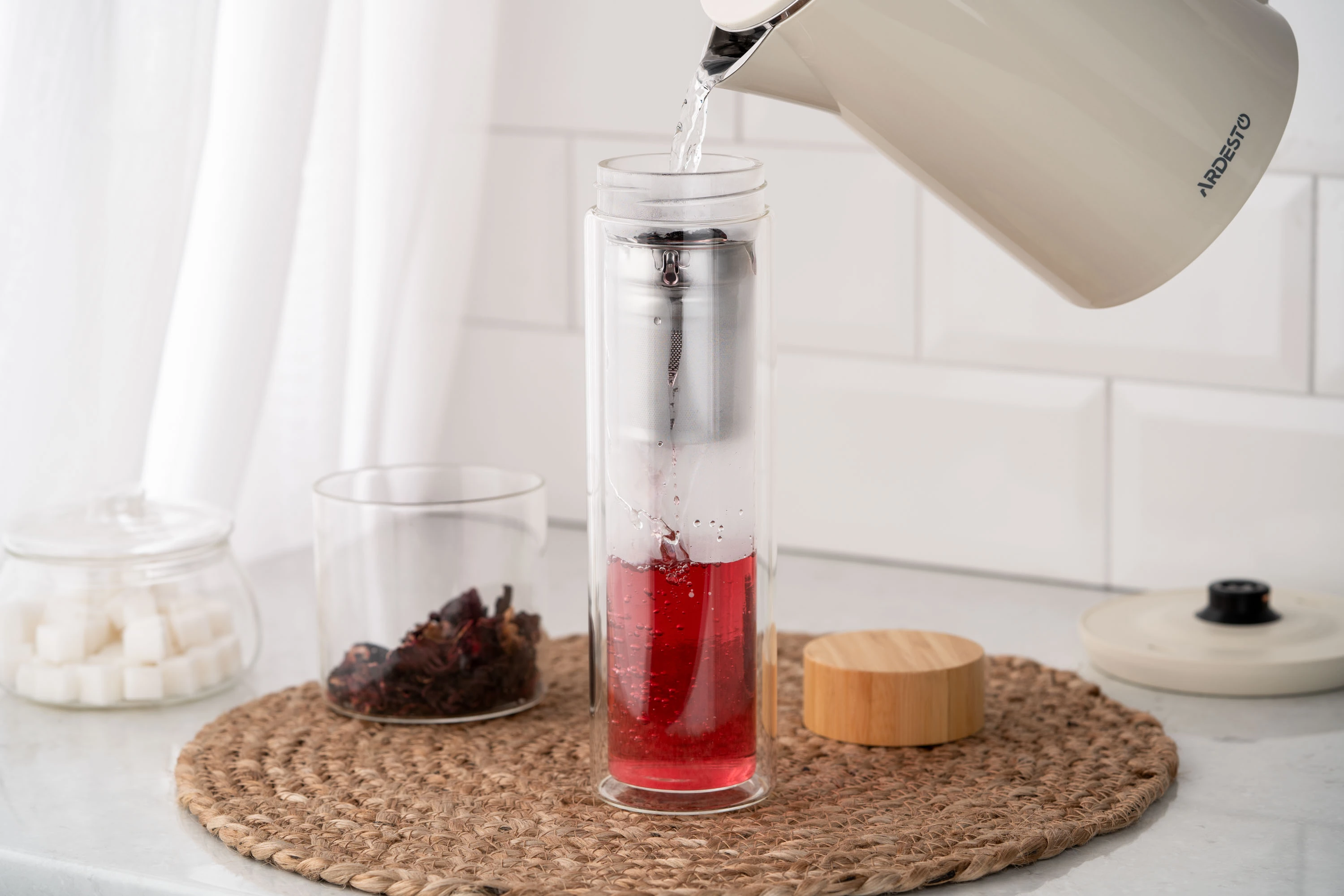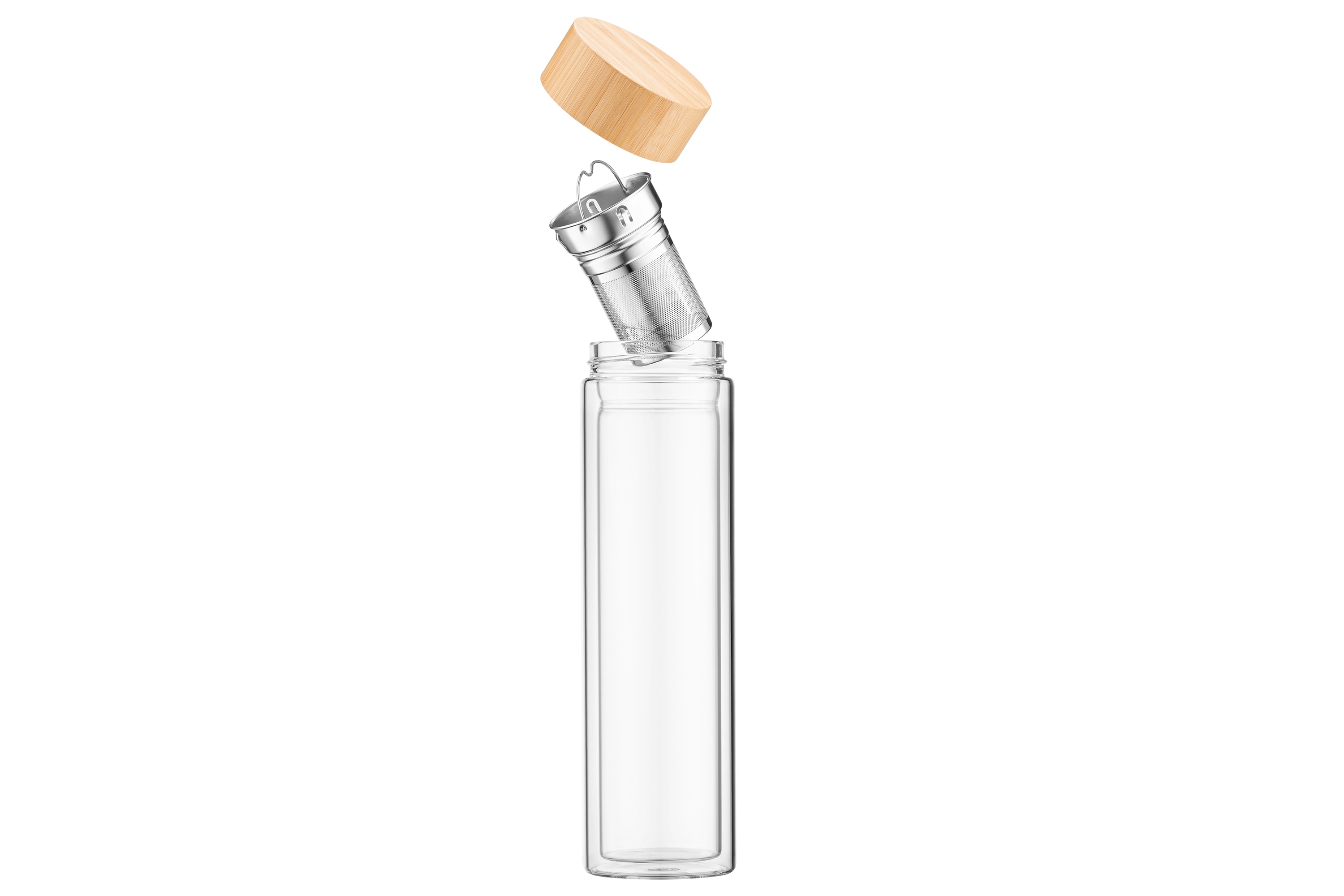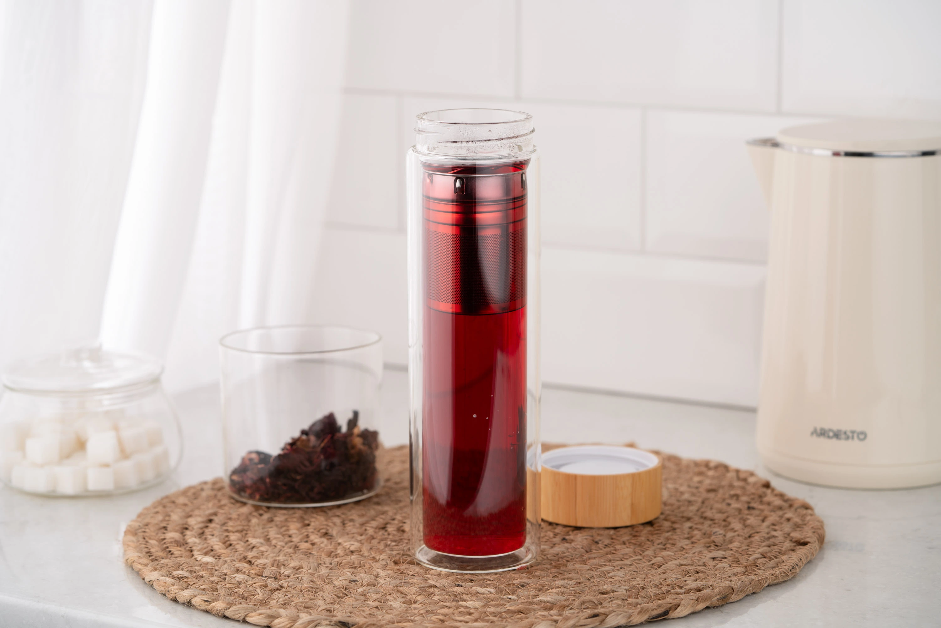 Вироблений із боросилікатного скла, термос із подвійними стінками ARDESTO об’ємом 450 мл підтримує оптимальну температуру улюбленого напою – як холодного, так і гарячого – упродовж 2 год. Ситечко з нержавіючої сталі забезпечує можливість легко заварювати чай прямо в термосі, а бамбукова кришка додає ноток природної елегантності. Діапазон термостійкості – від -20 до +150 °C, до того ж термос придатний до миття в посудомийній машині.