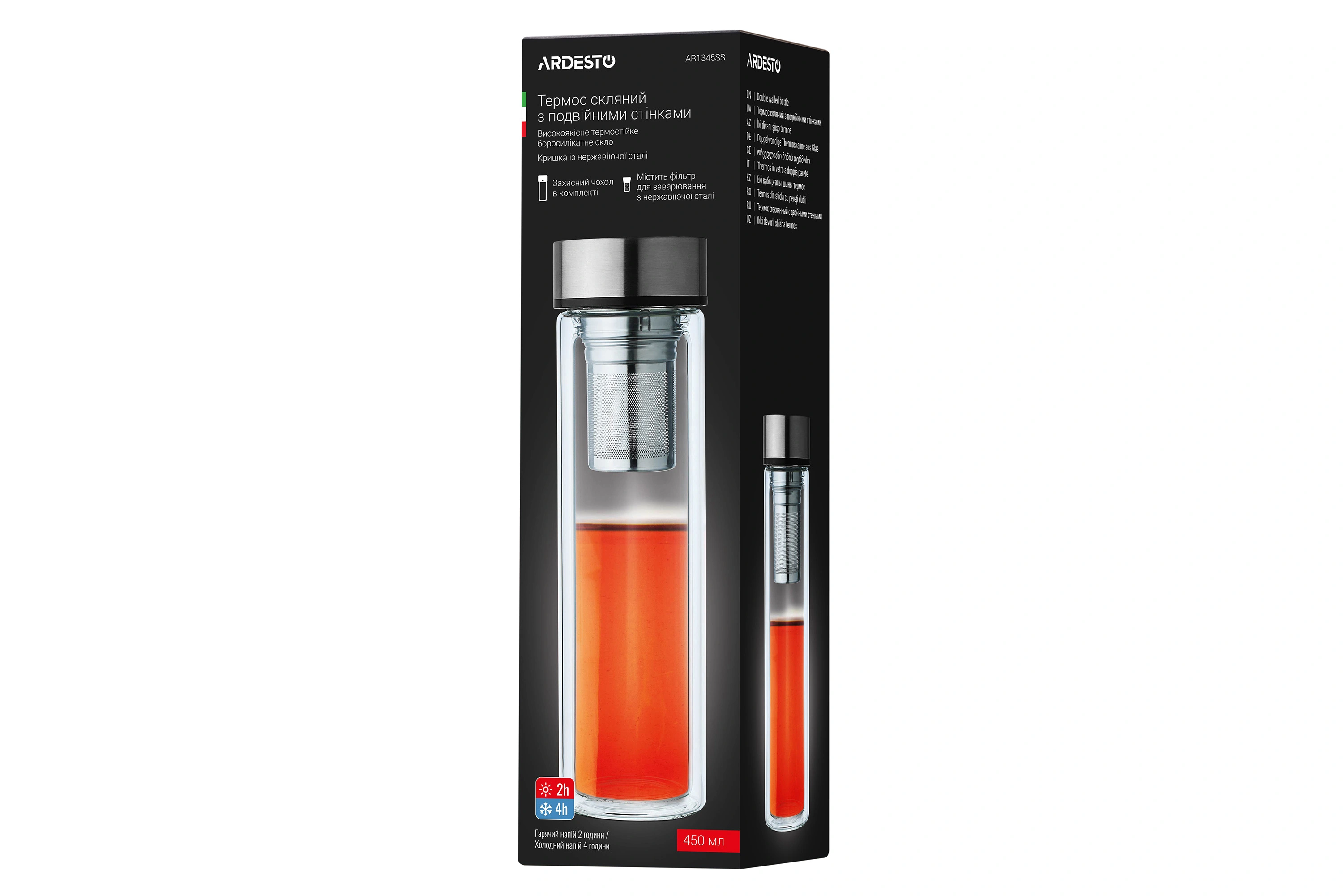 Термос з подвійними стінками Ardesto, 450мл, боросилікатне скло, нержавіюча сталь