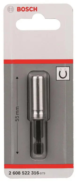 Тримач діаметром 10 мм, довжиною 55 мм, з хвостовиком із зовнішнім шестигранником ¼ дюйма. Завдяки магніту біти намагнічуються та міцно тримають гвинти. Під час початку закручування не доведеться притримувати гвинт. Без пружинного стопорного кільця.