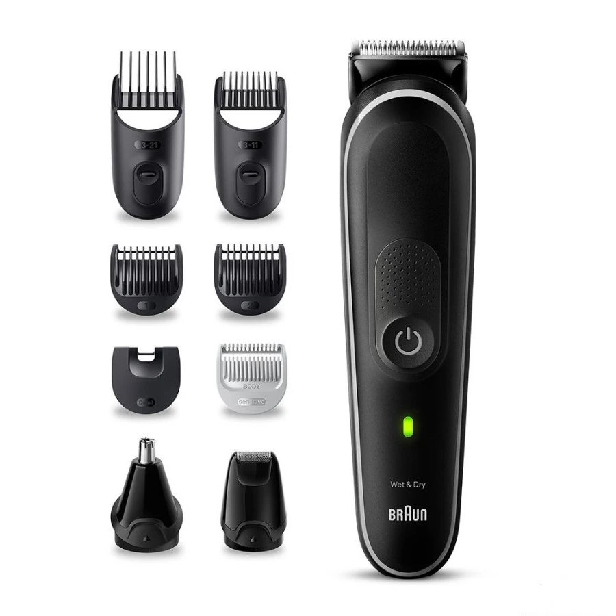 Тример для бороди, волосся на голові, носа та вух, для тіла. Сумки для зберігання. Два регульовані гребені (на 3-11 мм і на 13-21 мм). Насадки на 1 та 2 мм. Насадка-триммер для деталізації. Насадка точкова бритва. Насадка для носа та вух. Насадка для чутливих ділянок тіла Тример оснащений 13 налаштуваннями довжини з кроком 2 мм. Живлення: від Li-ion акумулятора. Час роботи від акумулятора 100 хв. Час заряджання 60 хв. LED індикатор стану акумулятора. Швидка зарядка за 5 хв. Зарядний пристрій адаптується до мережі будь-якої країни світу. Ножі, що самозаточуються, з необмеженим терміном служби.