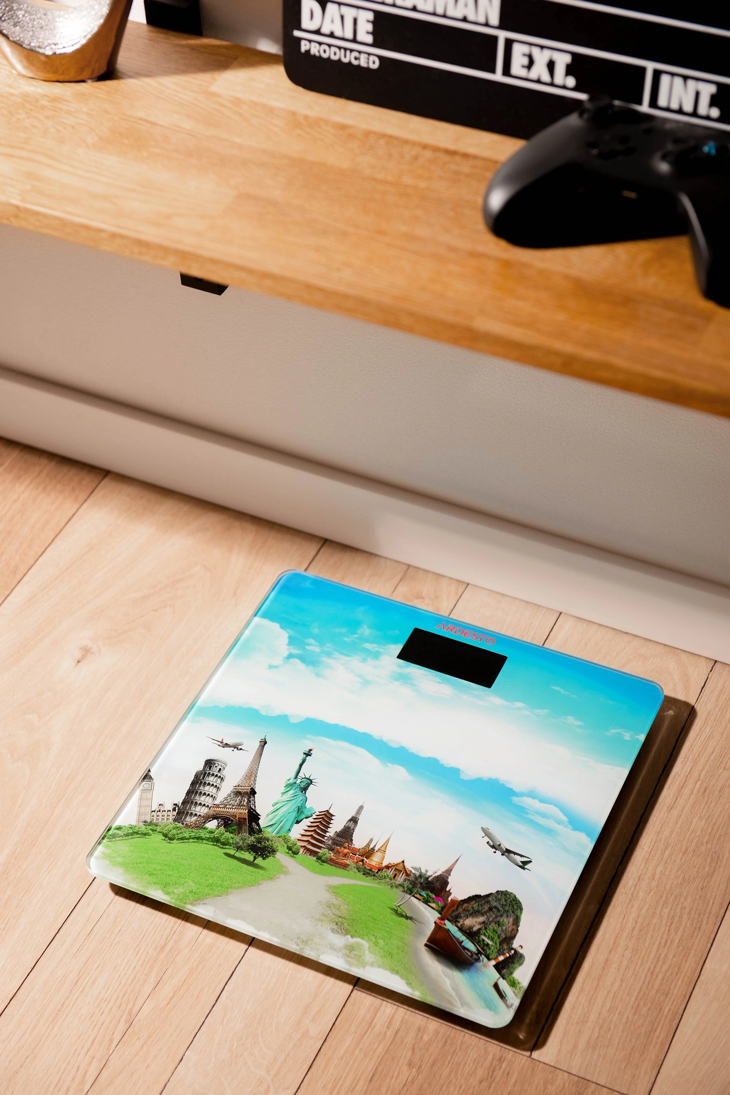 Підлогові ваги з дизайнерським малюнком. Призначені для вимірювання маси тіла та оснащені вбудованим термометром і функцією порівняння попередньої ваги. Модель SCB-965TRAVEL виконана в ексклюзивному дизайні. Малюнок подорожі надає вагам властивості модного аксесуара для прикраси будь-якого приміщення.