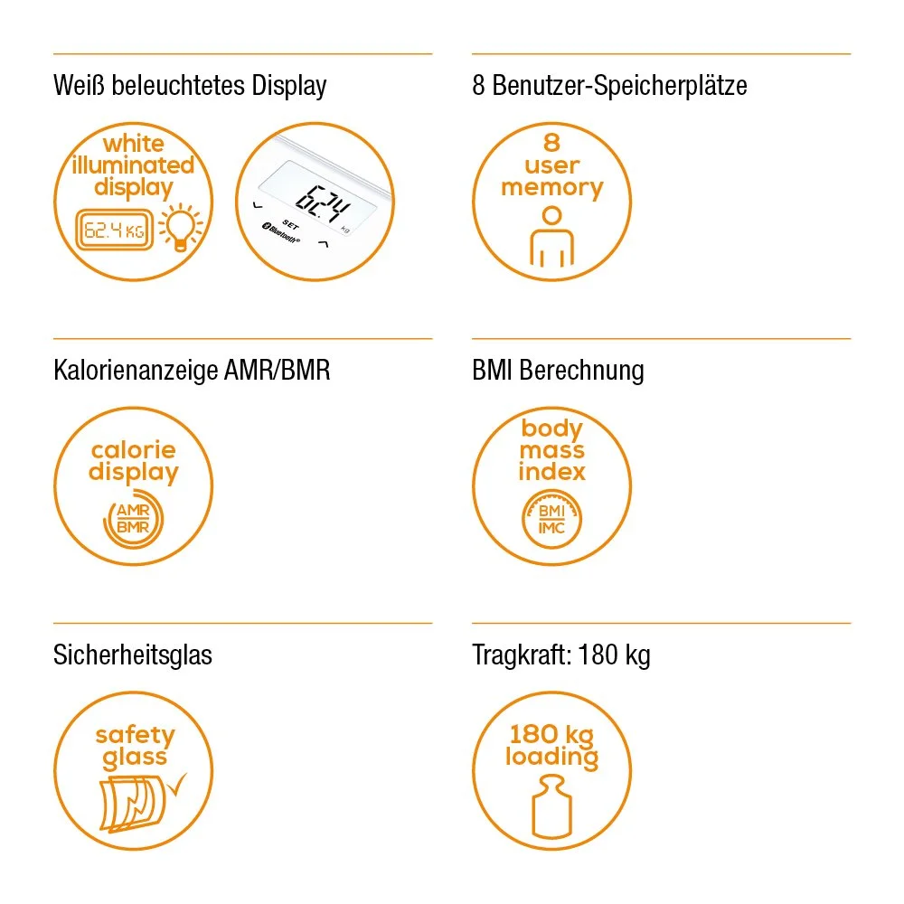 Ваги Beurer підлогові, 180кг, підключення до смартфону, сенсорний, AAAх2 в комплекті, скло, бі