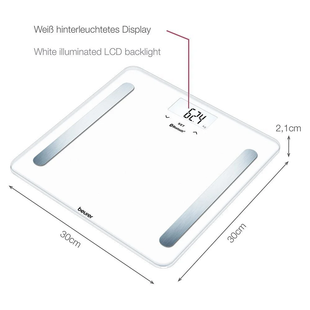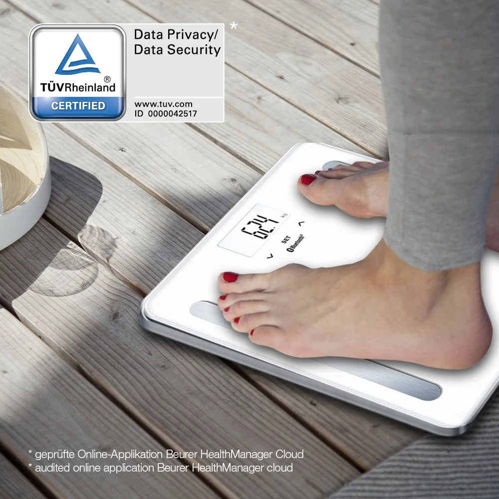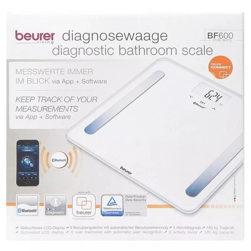 Інноваційні підлогові ваги Beurer BF 600 Pure Black з бездротовим під'єднанням до смартфона або планшета. Завдяки технології Bluetooth low energy результати вимірювань і дані про ваші фізичні показники завжди з вами — вдома, у дорозі, у подорожах. Для оптимального контролю ваги завантажте програму Beurer HealthManager через App Store або Google Play. Підлогові діагностичні ваги, крім простого зважування, дають змогу визначити частку жирової маси, тканинної рідини, м'язової та кісткової маси, рівень основного й активного обміну речовин, індекс маси тіла.